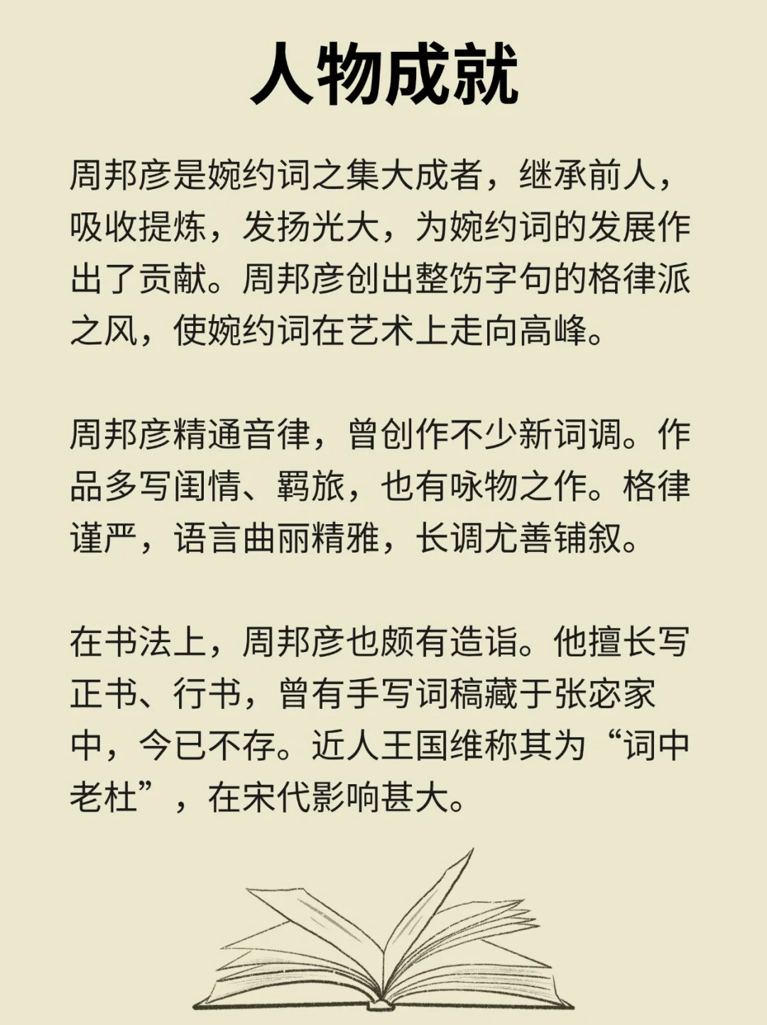 🍀周邦彦为后来格律词派词人所宗,其作品在婉约词人中长期被尊为“正宗”