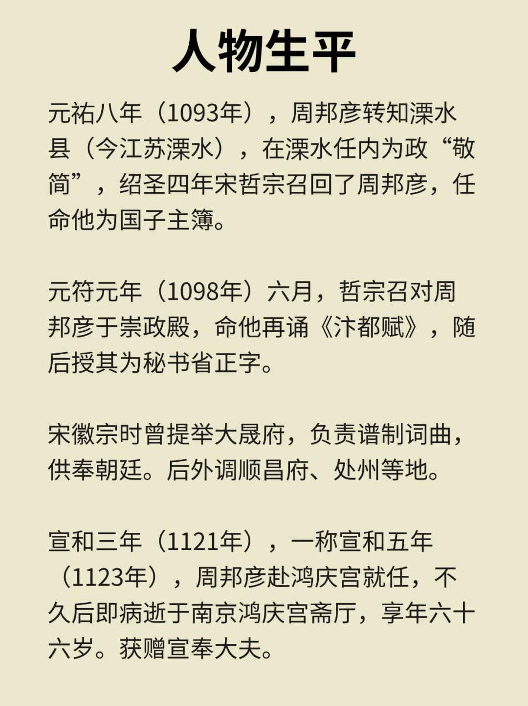 👉周邦彦虽然早期也有潦倒奔走之日,但仕途一直处于上升状态,逐步做到知府
