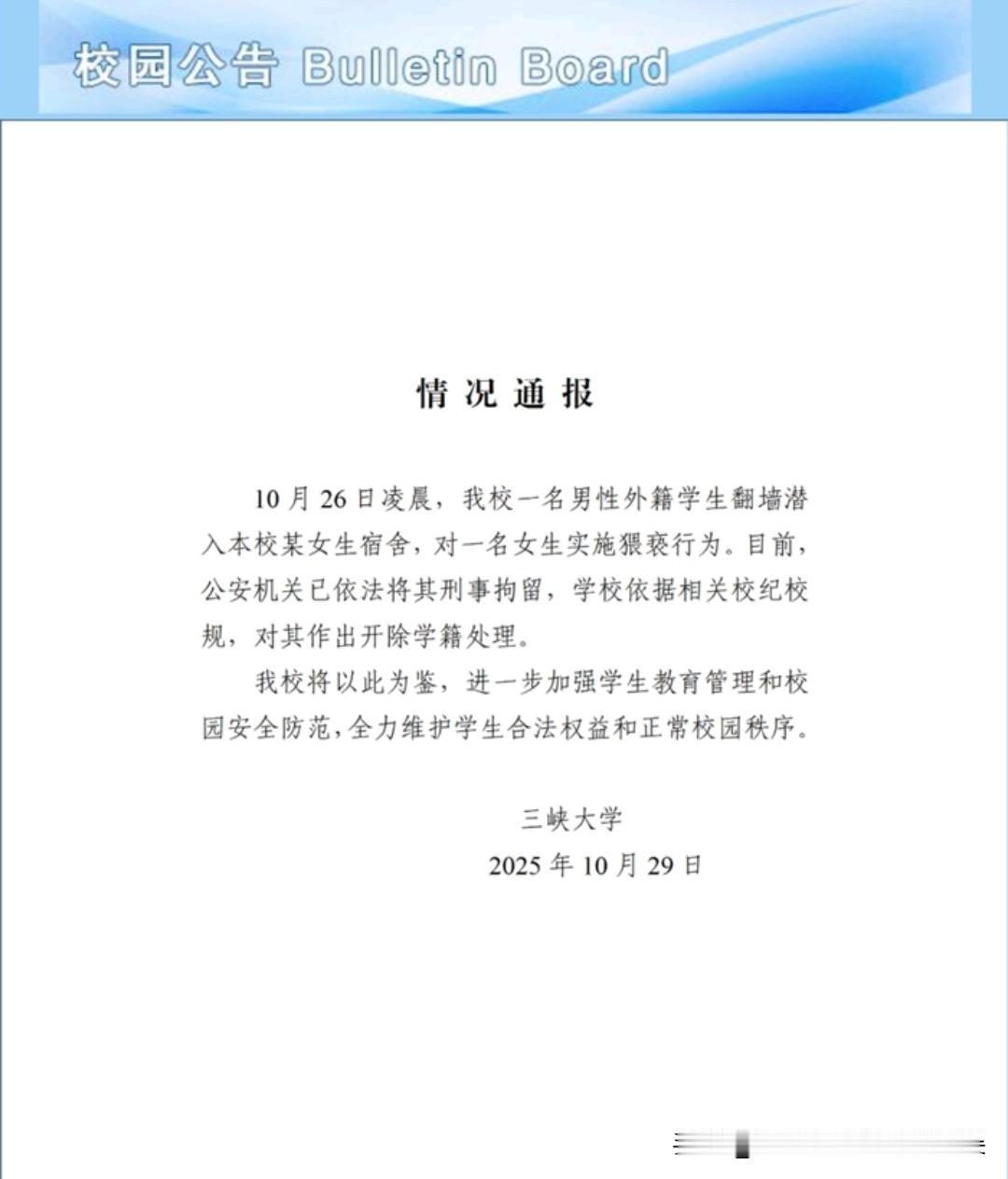 三峡大学外籍学生夜闯女寝猥亵被刑拘!校方:开除学籍,连夜加装防护网 ——校园安全再敲警钟,网友热议“外籍特权”与制度漏洞 文/自媒体综合报道 2025年10月29日,三峡大学就“外籍学生翻墙潜入女生宿舍实施猥亵”事件发布通报,引发全网关注。通报称,涉事男性外籍学生已于26日凌晨被警方刑事拘留,校方依据校规对其作出开除学籍处理,并承诺加强校园安全管理。事件细节与后续措施引发公众对高校外籍学生管理、校园安全等问题的激烈讨论。 事件回顾:凌晨翻墙入室,女生反抗致伤 据通报及多方信源披露,10月26日凌晨2时许,一名男性外籍留学生通过徒手攀爬铁窗,潜入三峡大学南苑学生公寓某女生宿舍二楼。目击学生称,该学生试图对一名女生实施猥亵,遭反抗后殴打对方致脸部受伤,随后逃离现场。女生惊醒后呼救,宿管人员报警,民警迅速到场处置。 值得注意的是,涉事宿舍楼与留学生公寓仅一墙之隔,且女生楼曾多次发生内衣失窃事件,校方此前已在一楼加装钢刺防护网,但二楼防护措施薄弱,成为此次事件的关键漏洞。 校方处理结果:刑拘+开除,连夜升级安防 三峡大学在通报中强调,已配合公安机关完成案件调查,并依据《三峡大学学生违纪处分规定》对涉事学生“从严从快”开除学籍。同时,学校宣布将“以此为鉴”,加强学生教育管理,升级校园安防设施,包括加装防护铁丝网、增设监控设备等。 辖区派出所工作人员透露,案件仍在进一步处理中,警方已与校方对接完善安全保障措施,后续将公布详细进展。 舆论焦点:外籍身份是否影响处置?校园安全如何保障? 1. “外籍特权”争议再起部分网友质疑,涉事学生作为外籍人士,是否因身份特殊而受到“从轻发落”?对比2019年河北工程大学外籍留学生猥亵女生后被行政拘留十日并遣返的案例,三峡大学此次直接开除学籍的处罚被认为“更严厉”,但仍有人担忧“法律执行尺度不一”。 2. 校园安全漏洞亟待填补事件暴露了高校宿舍管理的薄弱环节。网友指出,外籍学生公寓与女生宿舍相邻,且防护设施不足,为类似事件埋下隐患。专家建议,高校应建立“外籍学生行为规范档案”,并定期开展安全培训。 3. 法律与校规的双重约束根据我国《治安管理处罚法》,猥亵他人可处五日以上十日以下拘留,情节恶劣者可处十日以上十五日以下拘留。此次涉事学生被刑拘,或涉及更严重的暴力伤害情节。法律界人士呼吁,高校需与警方建立更紧密的联动机制,避免“以校规代法”。 后续:学生安全如何守护? 目前,三峡大学已对南苑宿舍楼进行全面排查,并计划联合辖区派出所开展反入侵演练。该校学生表示:“希望这次事件能推动学校真正重视安全问题,而不是‘事后补救’。” 网友热议: - “安全无小事,外籍不该成‘法外狂徒’!” - “建议所有高校宿舍加装人脸识别门禁!” - “严惩犯罪,才能让女生安心读书。” 此次事件不仅是一起个案,更是对高校国际化进程中安全管理能力的考验。如何在开放包容与风险防控间找到平衡,仍是亟待解决的难题。我们期待校方与执法部门以更透明的态度回应公众关切,共同筑牢校园安全防线。 (综合自三峡大学通报、封面新闻、百姓关注等)