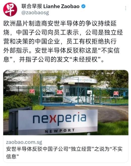 新加坡联合早报的报道:安世半导体中国子公司刚宣称“独立经营能拒外部指示”,就被荷