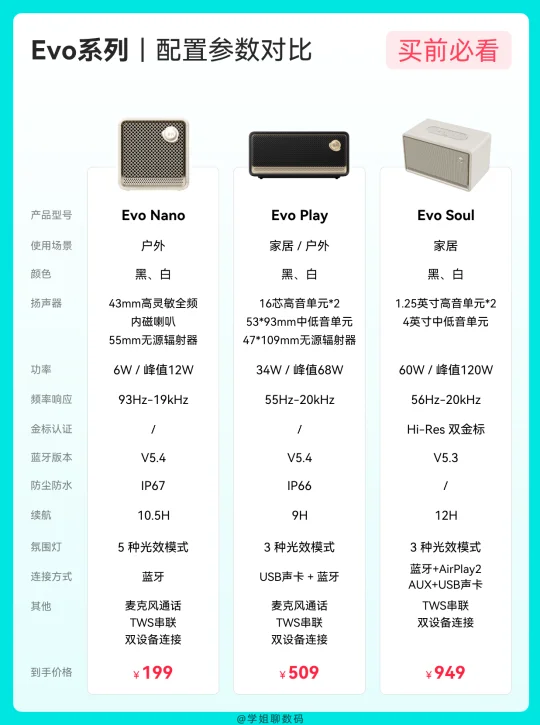 👉🏻 漫步者EVO系列音箱以简约质感设计著称,巧妙运用皮纹、织物等材质打造温馨家居氛围。学姐推荐Evo Nano,这款专为户外设计的防水便携音箱搭载全频内磁扬声器和无源辐射器,提供6W持续功率和12W峰值功率输出,音质表现出色,是营造露营氛围的绝佳选择。当前199元的价格兼具品质与性价比。
