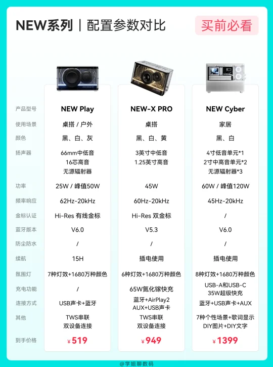 👉🏻 漫步者NEW系列以独特的声学海景房造型和可自定义彩屏为最大亮点,专为追求极致桌面美学与科技体验的用户打造。学姐推荐New Cyber,创新海景房造型搭配拟物风扇氛围灯(1680万色可调),支持多功能彩屏支持动态歌词显示及原创主题切换。独立声学腔体结构,还有大师级调校,提供60W持续功率/120W峰值功率,双十一1399元就能入手,是桌面发烧友的理想选择。