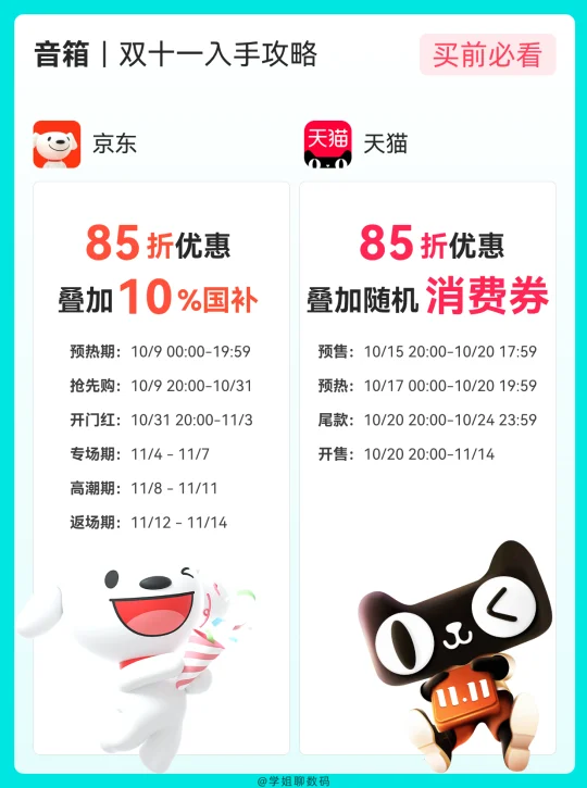 🛒 双11大促期间,漫步者EVO/NEW/Halo三大系列音箱在京东和天猫都有活动,全系享受85折优惠,京东还支持叠加10%国家补贴,天猫则是提供随机消费券立减,有计划入手音箱的宝子趁现在好价快冲鸭!