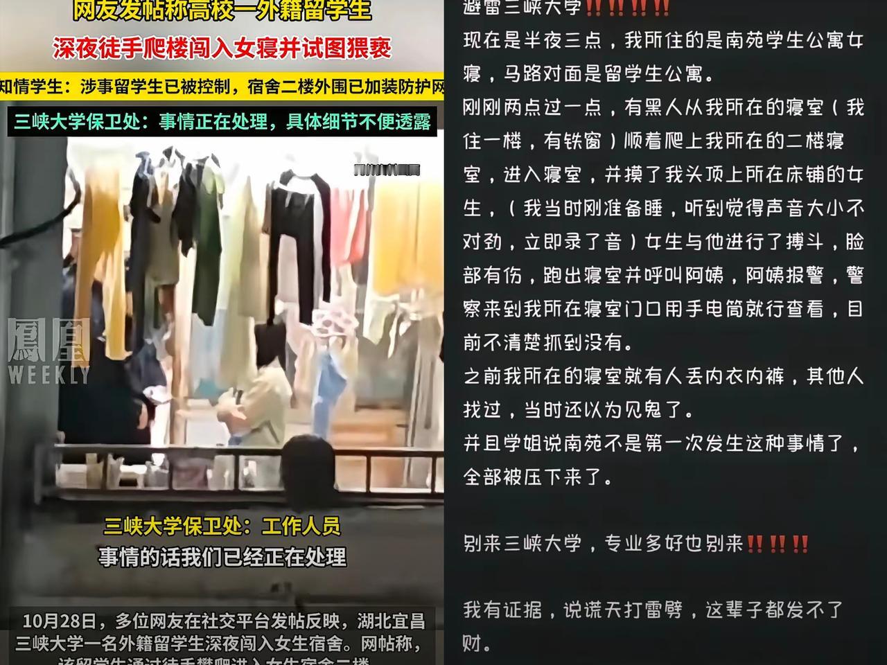 某大学外籍留学生半夜翻入女生宿舍,企图强了女生, 结果因女生高声呼救未遂。 明明是强奸未遂, 结果报道都在说猥亵! 25号凌晨发生的事,隔了好几天才见报道,小红书上最初的爆料人都搜不到了。虽说警方已经刑拘、学校也开除了学籍 ,但从“企图施暴”到通报里的“猥亵”,从事发到公开的时间差,难免让人多想。法律上强奸未遂和猥亵有明确区别,可公众要的不只是罪名认定,更是对“安全”的明确态度。 现在宿舍加了铁丝网,但更该补上的是“不拖延、不遮掩”的态度吧?你觉得这种事该藏着掖着吗?来聊聊你的看法!晒图笔记大赛留学生