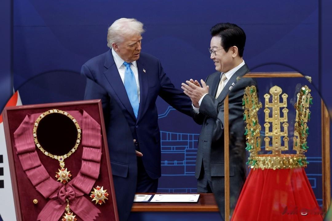 李在明送礼送到了特朗普心坎儿里。 李在明送给了特朗普一件黄金打造的金色新罗王冠模型。据制作这这个金王冠的文物修复专家介绍,该王冠是以天马冢出土的金冠为原型制作的模型,与其它王冠相比,其尺寸更大且更华丽,是韩国国宝。其它王冠通常有3个“出”字形装饰,而这个有4个。这个王冠模型使用了1000克黄金在表面镀金制作,且纯手工,耗时1个月,其精细程度堪比真品。 此外,李在明还授予特朗普象征外宾最高敬意的无穷花大勋章。 看特朗普的反应,对这两件礼物很是满意,表示将永远珍视这份荣誉,它意义非凡,并且恨不得马上就戴上这个王冠。 这李在明送礼确实送到了特朗普的心坎里,是摸准了他的脾性:喜欢荣誉,从他一直想拿诺贝尔和平奖可以看得出来;要“王权”,他喜欢被奉承,喜欢自己说了算,享受大权在握的感觉。 李在明可太会了,比尹锡悦高了不知多少。