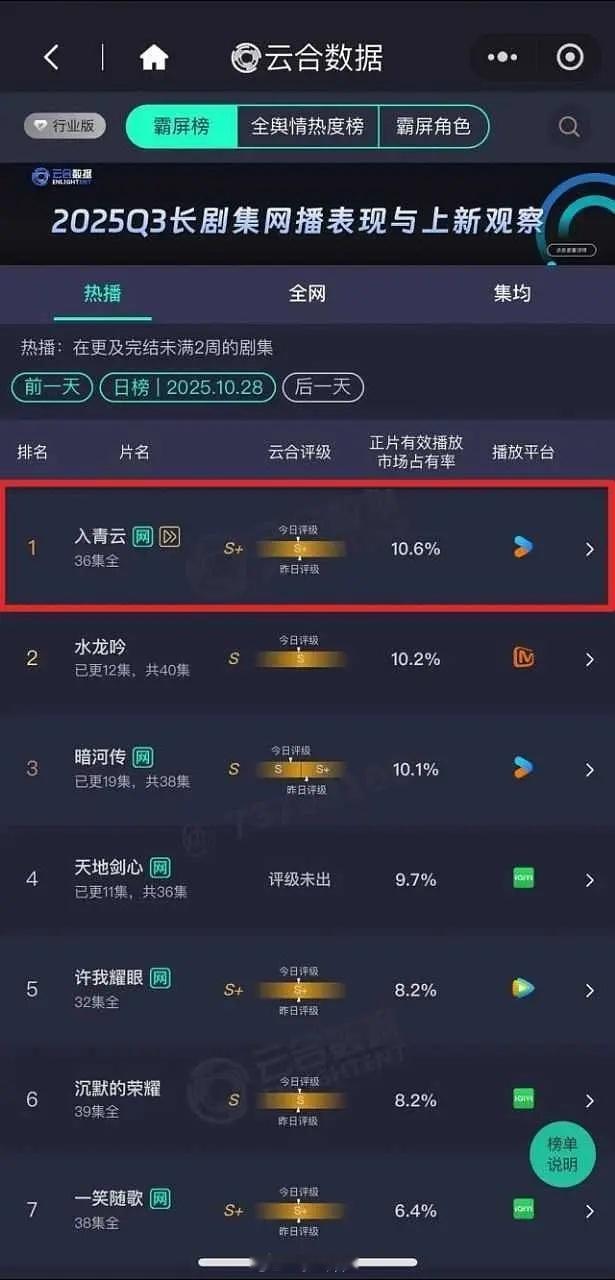 昨天《入青云》官微发了登顶云合四天战报,结果没想到还能登顶第五天