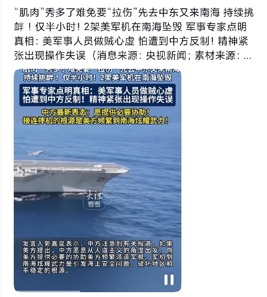 美军航母南海丢脸 | 30分钟连坠两机 | 中国网友狂欢吐槽 30秒内接连两架飞机掉海里!尼米兹航母的神话就这么结束了?中国网友逗趣说:南海龙王发威啦~美媒瞎猜是电磁干扰,结果被自己人打脸,我国外交部沉着回应,尽显大国气度!(配图:航母甲板事故现场) 才半分钟,两架战机就连续坠海!尼米兹航母的甲板瞬间成了“灾难现场”,美军在太平洋的霸主面子被彻底揭穿!MH-60R直升机刚砸进水中,F/A-18F战斗机又跟着扑通落水,这哪里是军事演习?根本就是大型翻车现场啊~ 美国网友异想天开,想把锅甩给中国的“神秘科技”,胡扯什么电磁干扰、超级武器?结果被自家军事专家直接反驳:分明是航母太老旧、人员过度疲劳、维护保养跟不上!查查数据就明白,美军近几年战机事故率猛增47%,拦阻索老是出问题、误伤事件不断,这推卸责任的手法也太没水平了! 中国外交部的回应才叫高明:既肯提供人道主义救援,又提醒美军少在南海炫耀武力。既展示了国家担当,又悄悄点出重点——整天开着破旧航母全球瞎逛,出事是难免的! 要知道,美军航母自打冷战结束后,就没真正应对过强硬对手,欺负小国还行,真要碰上狠角色,这些“纸老虎”能顶得住吗?看看甲板上手忙脚乱的救援场景,再瞧瞧福建舰稳稳进行海试,差距明显啊! 有人调侃是南海龙王显灵,我说这就是天道轮回~不过说笑归说笑,现代战争最终还得靠真刀真枪的装备和训练,大家觉得美军这次连环事故到底揭露出哪些根本问题?