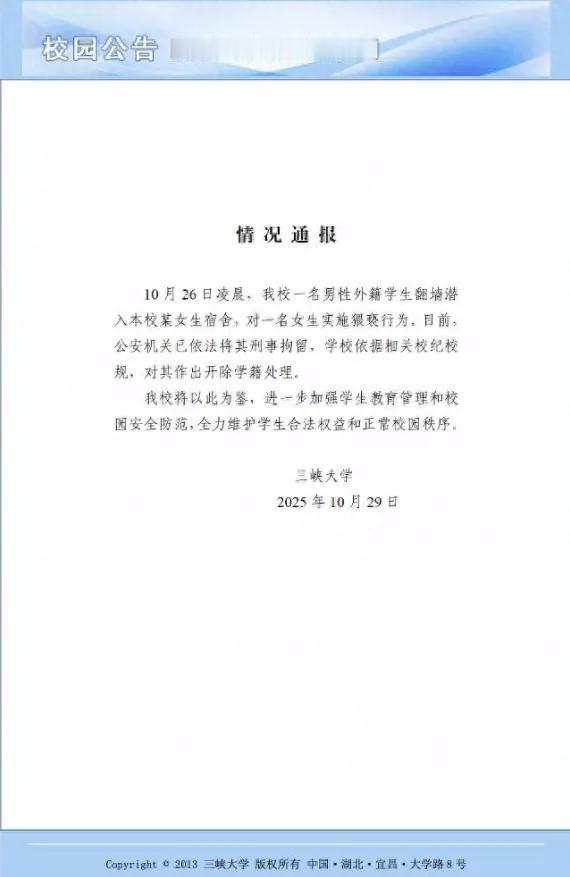 拿着比国内学生高太多的待遇,竟然还做出这种事? 半夜两点,留学生徒手爬进女生宿舍猥亵打人。三峡大学回应开除加刑拘。 虽然是留学生,但外国人犯罪一样要按中国法律判,猥亵加上非法入侵,最高可判三年!说白了,留学生标签当不了免罪金牌,法律面前谁都没有特权。 国际化不是无原则包容,安全底线更不能区别对待!宿舍楼对面就是留学生公寓,管理肯定是漏洞。 如今校方关闭官微评论,但民心堵不住。一句话!校园安全,防住墙外之手前,也要有责任之心。