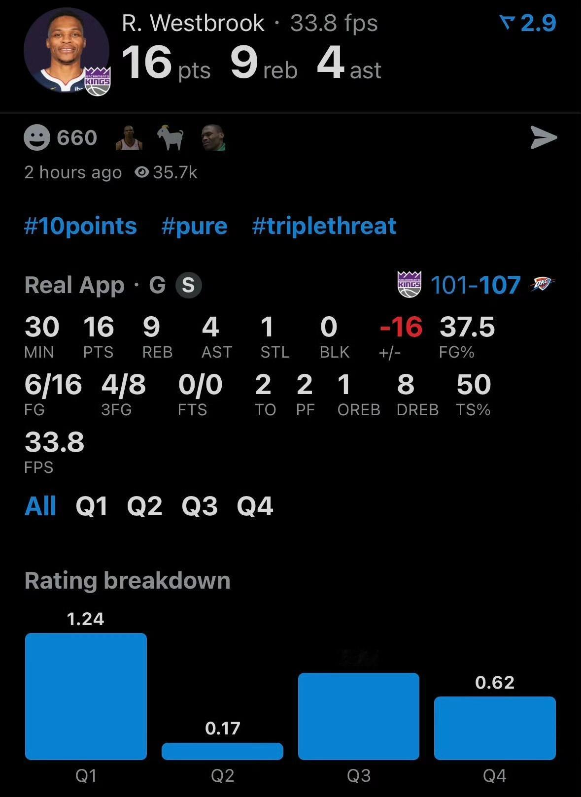 威少的360万美元底薪是无保障的,今天他的表现值得给吗? 对阵雷霆,首发出战30分钟,投篮16中6,三分8中4,得到16分9板4助1断2失误,正负值-16。 可惜输球了,国王101:107雷霆,末节崩盘,威少又是赢了数据,输了比赛。