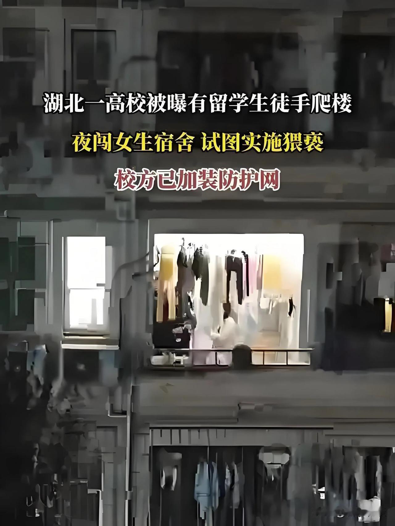 不得了,湖北一高校被曝有留学生徒手爬楼,夜闯女生宿舍 留学生闯女生宿舍? 女生宿舍夜里有人闯进来,想想都让人脊背发凉! 女生们半夜该多害怕?父母看到新闻该多揪心?学校是读书的地方,不是冒险乐园。 留学生身份不是护身符。法律面前人人平等,该处理必须严肃处理。希望学校加强安保,别让宿舍楼变成谁都能爬的“练习场”。更要一视同仁,给所有学生实实在在的安全感。 象牙塔里要容得下一张安静的书桌。安全这张网,一刻都不能松懈!