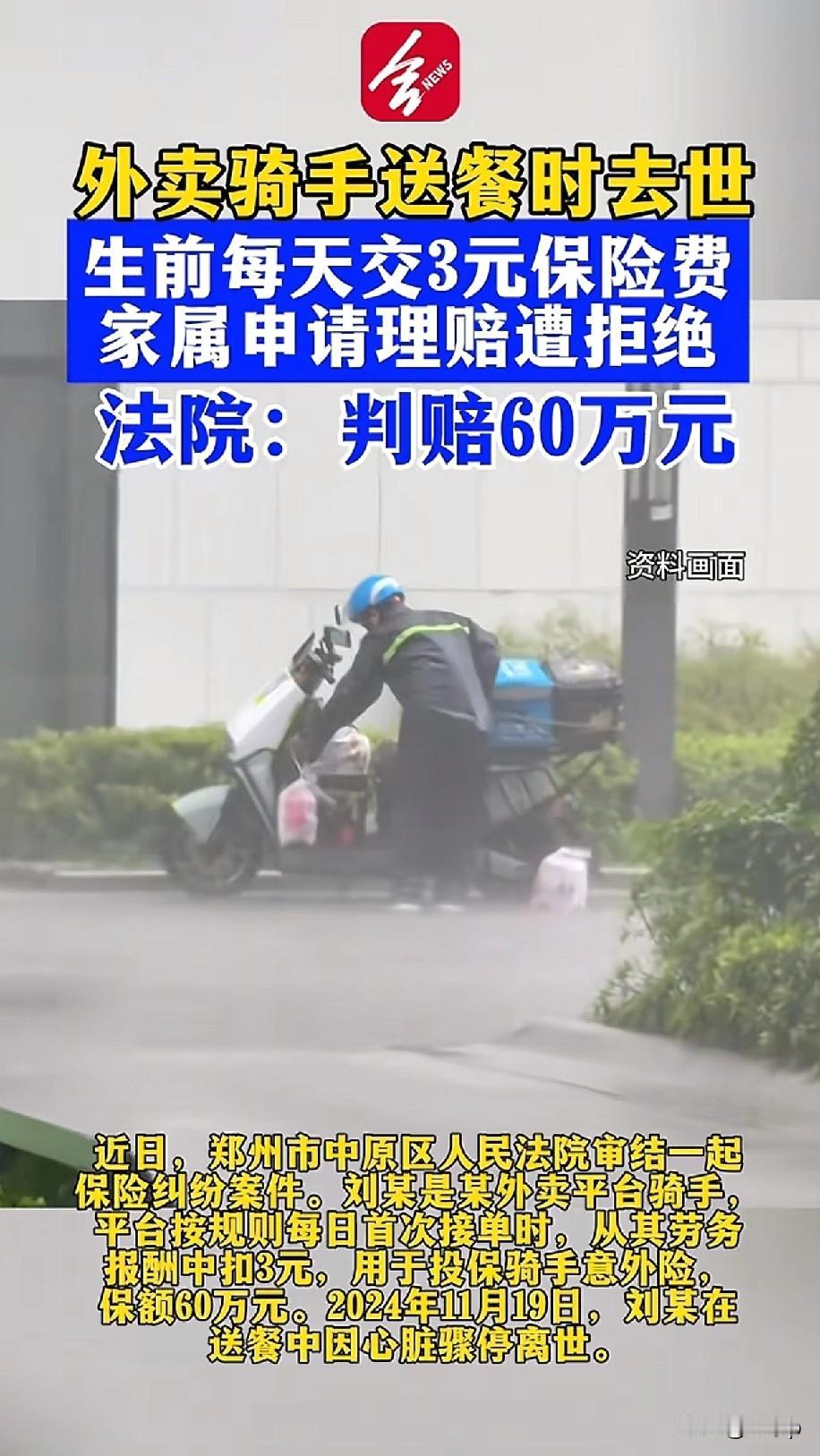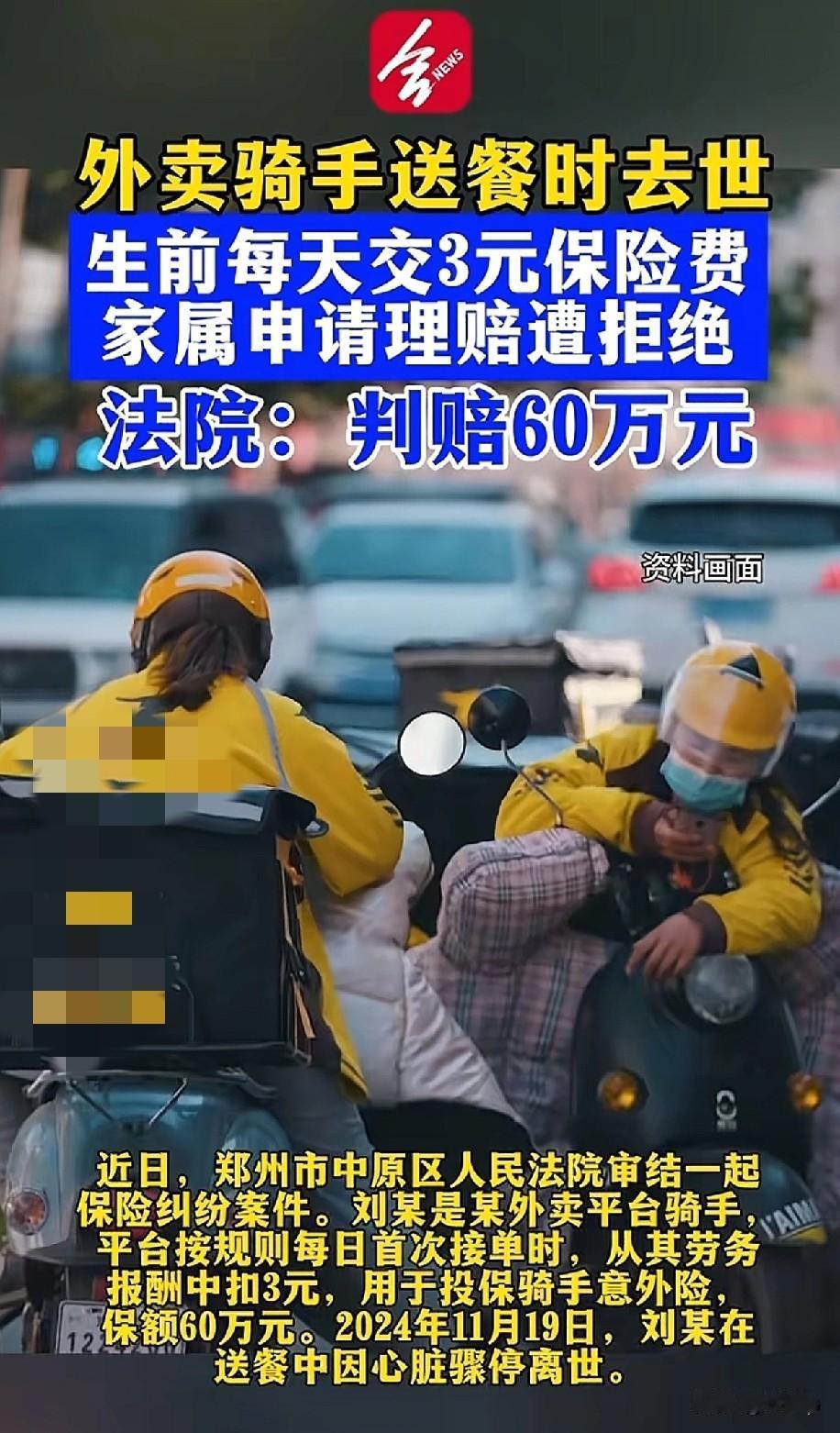 郑州外卖员送餐中意外离世 之前每天扣3块保险费可保60万,但去理赔后却遭遇保险公司刁难 法院判赔60万,事情发生在去年11月份,事情发生后家属多次找深圳市分公司众包骑手意外险要求理赔,但都被他们以骑手自身患病为由拒绝,家属只好诉至法院,开庭的时候保险公司的人也没来,也没有安排委托其他人来,最终法院根据相关法规判定保险公司应当向骑手家属支付60万,并以及履行完毕 投保容易,理赔难,现在还仍然存在,有时候理赔还要找熟人以及给中介人好处费才能办成,这真是有点太扯了,希望他们得好好整理一下了