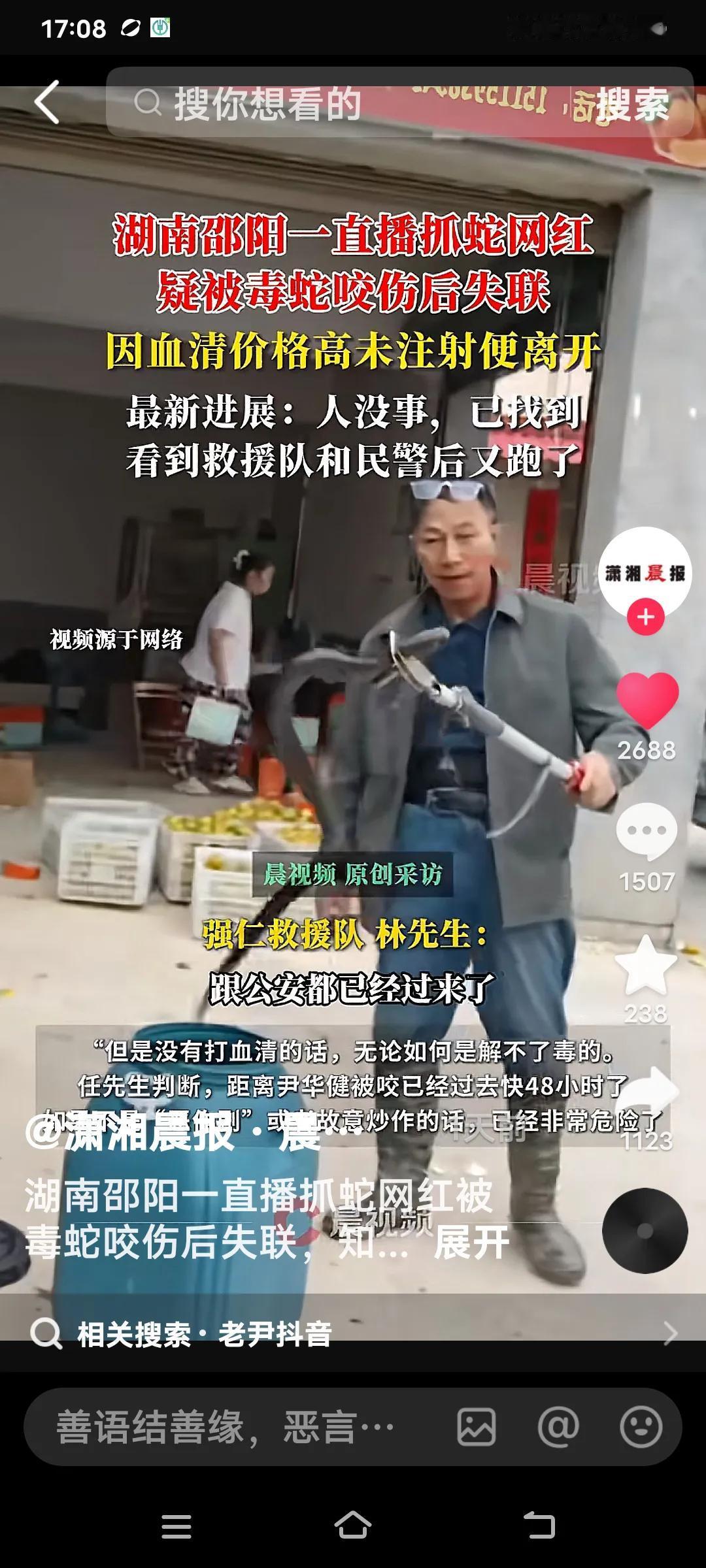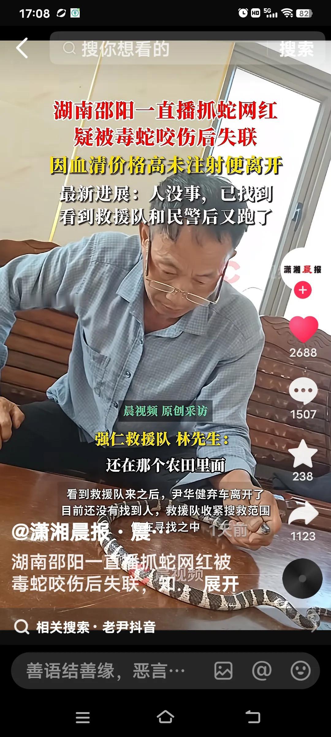 湖南邵阳洞口县的尹某某59岁,真叫人又气又恼。他是个“直播抓蛇”的网红,10月26日晚直播挖蛇洞时,不幸被银环蛇咬到左手指。送到医院后,医生说要注射血清,他却嫌贵,自行离院了。 他朋友说,他搞直播抓蛇,就是因为没钱,舍不得花钱打针才跑的。不然谁会干这事儿呢?他失联的那两天,可把大家急坏了。好在最新消息是,人已找到,并无大碍。 归根结底,就是没钱闹的。他舍不得打针,所以自行离开。但换个角度想,有健康的身体,还怕挣不到钱吗?他身体其他方面都挺好,手指被咬伤,听医生的才是正理。怎么还和救援队、民警玩起了捉迷藏呢? 看他还跑,能跑得掉吗?要知道,一个人失联,会让多少人担心啊!这样的情形,看着就让人心酸。怎么能因为没钱,就不把命当回事呢? 景区蛇 农村抓蛇 抓蛇高手在民间