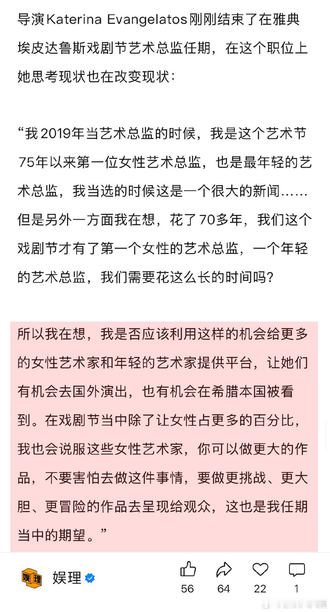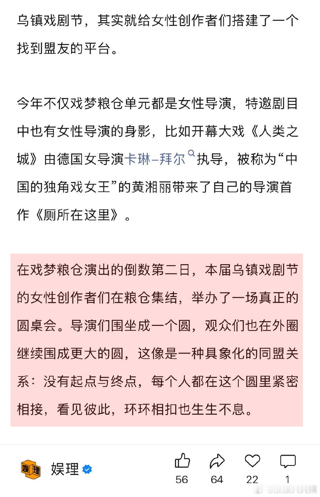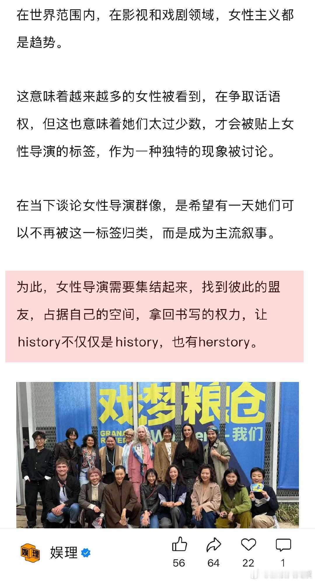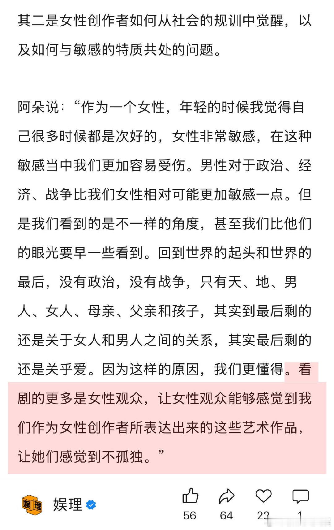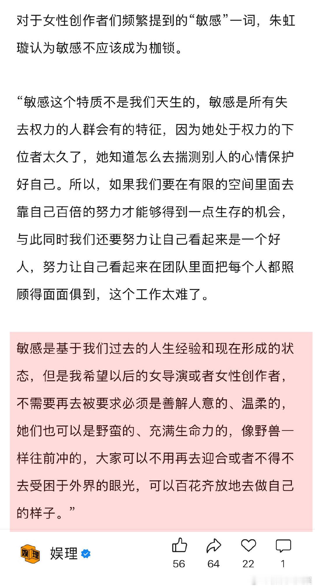 女性创作要让女观众不孤独 女性创作者 像野兽一样往前冲 对于女性创作者们频繁提到的“敏感”一词,女导演朱虹璇认为敏感不应该成为枷锁。“敏感这个特质不是我们天生的…敏感是基于我们过去的人生经验和现在形成的状态,但是我希望以后的女导演或者女性创作者,不需要再去被要求必须是善解人意的、温柔的,她们也可以是野蛮的、充满生命力的,像野兽一样往前冲的…”娱理独家↓