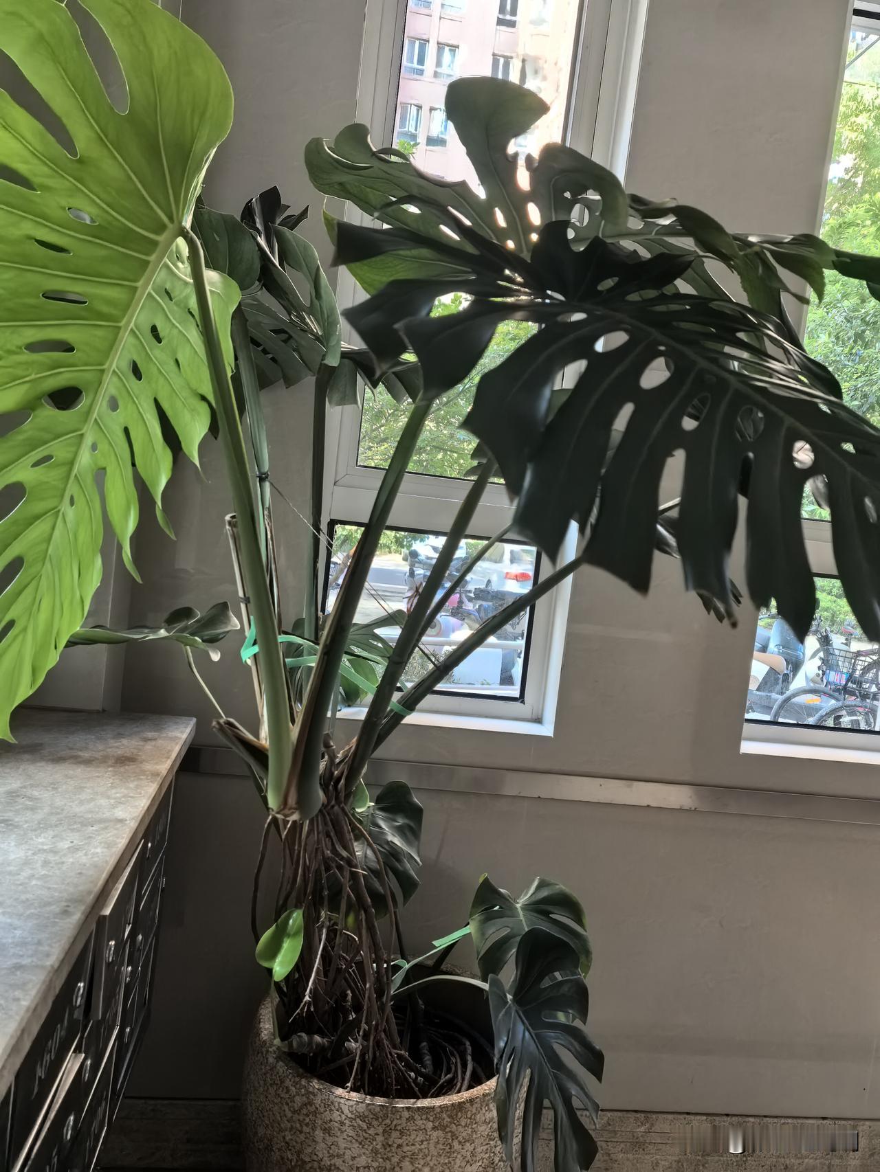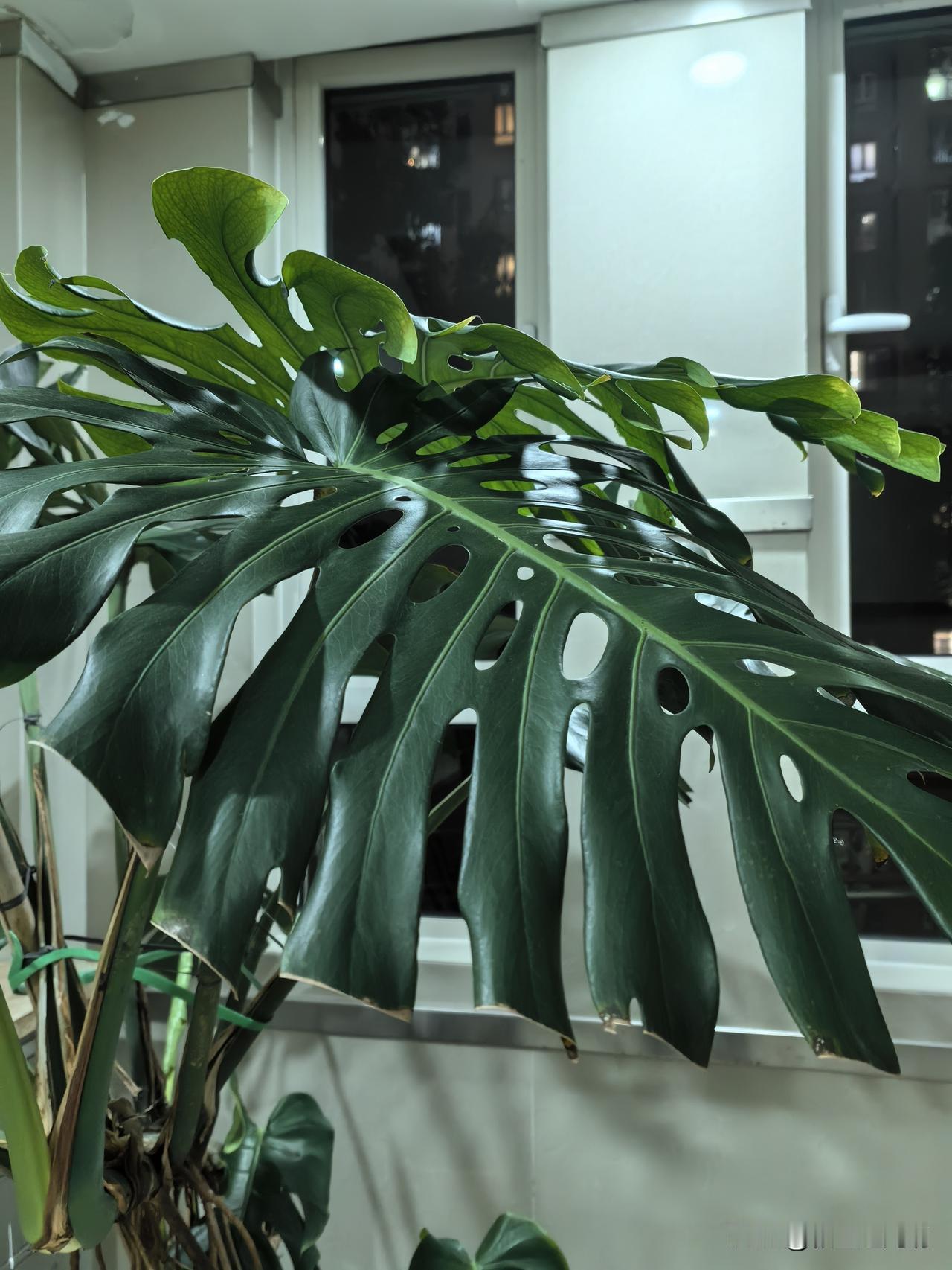 龟背竹 门厅里谁放了一大盆龟背竹。 这龟背竹养得真好,叶子有蒲扇那么大,每片叶子都裂成了龟贝的纹路,根系很多露在外面,看起来盆里都没有多少土,都是龟背竹自己的根盘在一起。 有两根较粗的根又向上发成了两棵绿苗,如果分栽应该也能成活。 龟背竹的茎有些软,中间主人用了一根竹竿支撑起它的重量。 这盆龟背竹放在一个带轮子的滑车上,应该是主人临时放在这里。 前段时间看一篇报道,龟背竹可以自己找水喝。说的是一位粗心的主人忘了关照自己养的龟背竹,龟背竹在烈日暴晒下,奄奄一息。不会说话的它展开了自救,楞是长出一条长长的根须,像根管子一样通往外面的水沟里,汲取水分续命。那株龟背竹虽长得不够强壮,但还活着。 可见,龟背竹的生命力足够强大。因为有时会外出一段时间,家里养的植物也是耐旱省心的物种偏多,或吊兰,或虎皮兰,或仙人柱、绿萝之类。 栽过几次龙须草,没有成活,后来也栽了一盆龟背竹,既净化空气又好养,但还没有开背。有介绍说,到第三片叶子时,就会裂开了,现在已不止第三片叶子了,还没有裂开的迹象。 我的龟背竹叶子还不够大,茎叶也确实有些软弱无力,我把这株的叶子牵到一起,才让它们互相帮扶,勉强站住。 花盆里的粘土可能也不是龟背竹喜欢的,它应该喜欢透气性强的土壤。 何时能长到门厅这株的样子,就很满意了。
