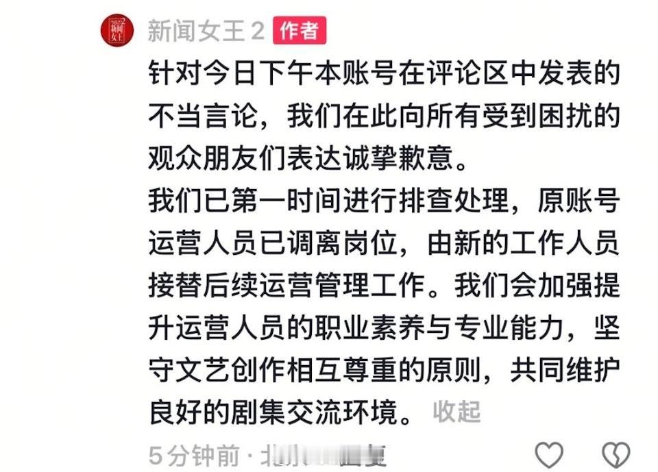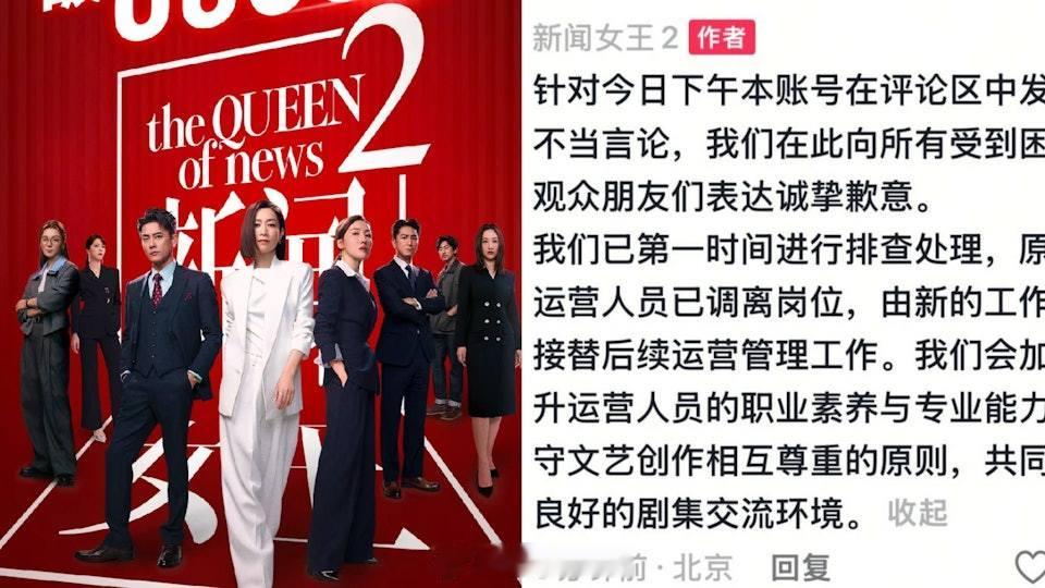 由佘詩曼、黃宗澤、李施嬅主演的《新聞女王2》,自開拍以來便備受期待,劇集亦會作為今年無綫(TVB)重頭台慶劇,將會在11月播出。不過,最近《新聞女王2》的官方帳號因回覆網民的評論而飽受爭議,日前《新聞女王2》就運營不當言論公開致歉,並將帳號運營人員被調離崗位。