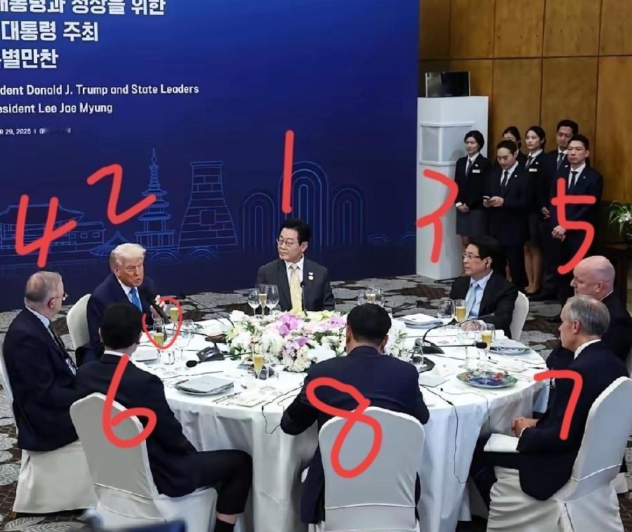 李在明宴请各国元首,一桌8人都有谁?除了1李在明、2特朗普排在主位,其他依次:3越南国家主席梁强、4澳大利亚总理阿尔巴尼斯、5新西兰总理克拉森、6新加坡总理黄循财、7加拿大总理卡尼、8泰国总理阿努廷!看坐次,主位很正常,其他这6位特别加拿大总理卡尼,排末位!不知道韩国按照什么排的!还有,特意给特朗普,单独准备了一杯可乐🥤!