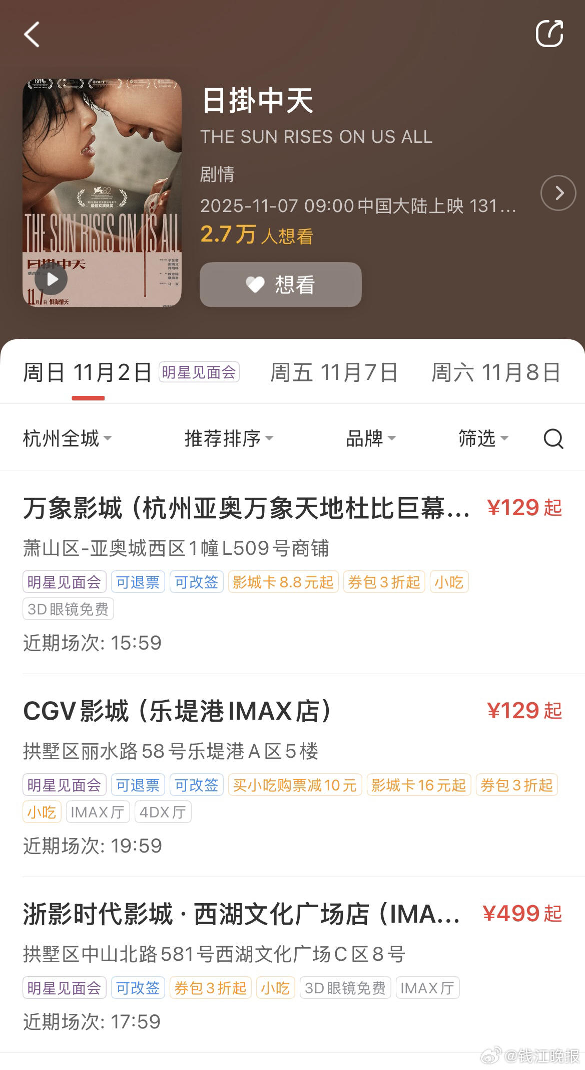 《日掛中天》11月2日杭州路演预售一开,就受到影迷热情追捧。截止至记者10月28日发稿时,路演四家影院有三家显示见面会场全部售罄,只有浙影时代影城·西湖文化广场店还剩一二排的几张票,票价更是高达499元。