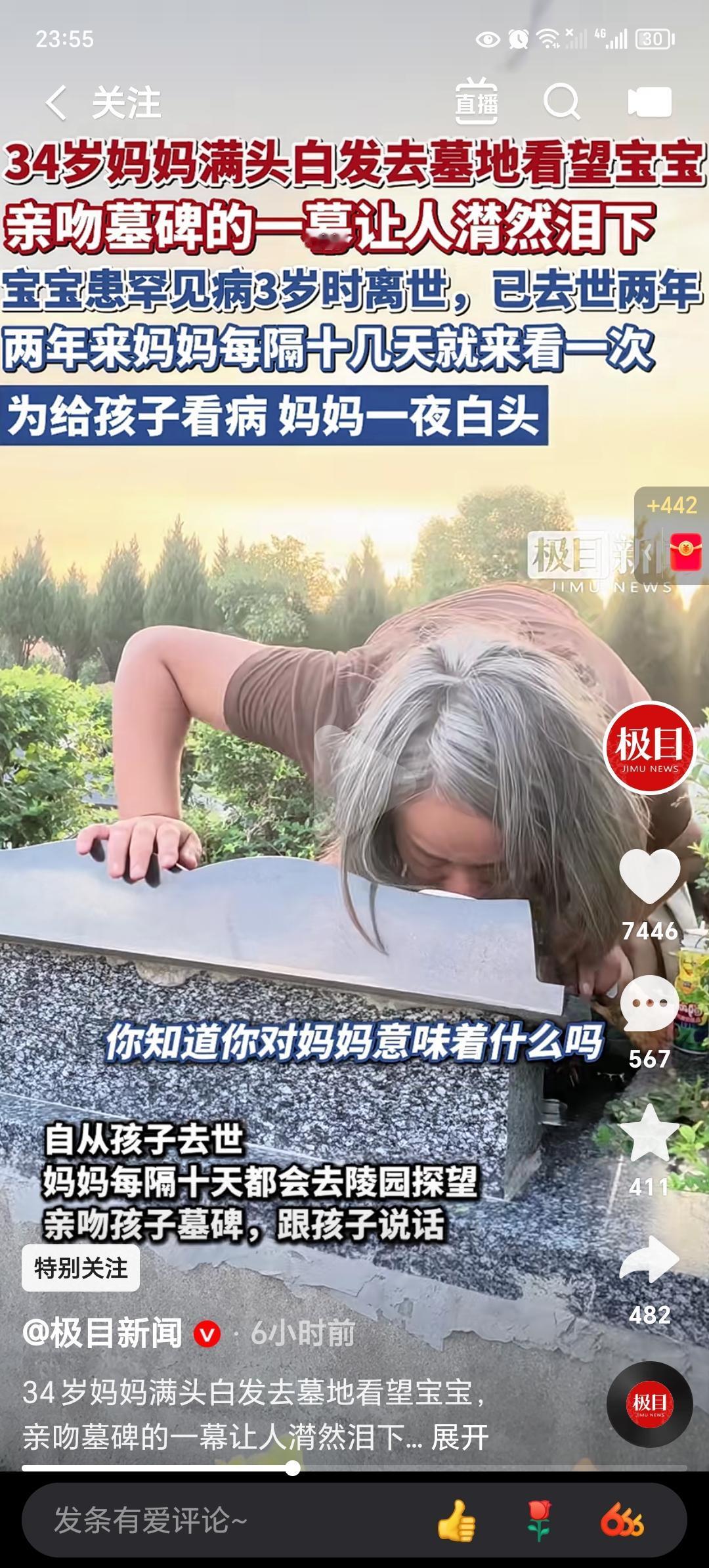 34岁白发妈妈,你放手吧! 孩子3岁去世,已经两年了! 网友们真受不了啦! 孩子妈妈10几天就来一次,每一次还亲吻墓碑。孩子是因病去世。 只要是当妈妈的人看到这个视频都受不了。大家跟着她心痛,悲伤,难过。 你是个好妈妈,放手吧,放过天堂的孩子,也放过你自己!大不了几十年后又见面了。但是,没摊在自己身上,谁也无法体会她的心绞痛,肝肠寸断四个字是现实活生生的例子衍生出来的!
