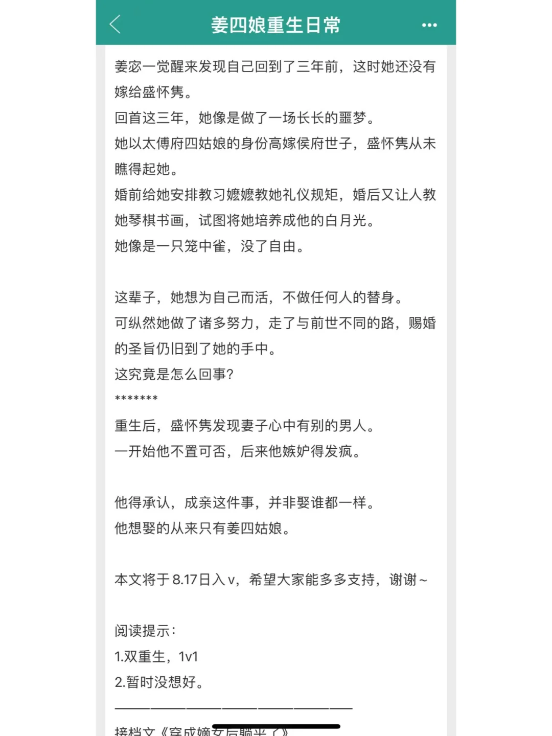重生前女主一直生活在压抑的侯府中,男女主之间的交流很少,日渐心灰意冷。直到男主告诉女主,她亲生母亲的死亡不简单。再次睁眼的时候,女主发现自己重生到了三年前。