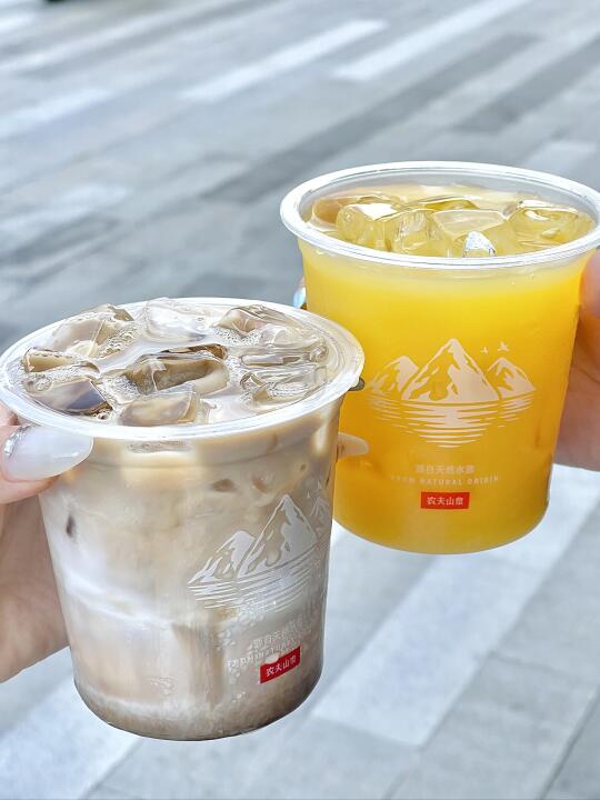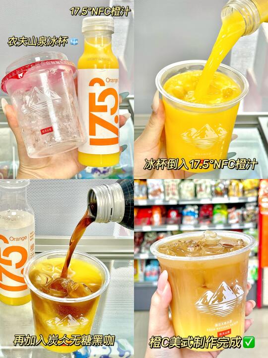 3.橙c美式🍊:农夫山泉冰杯🧊➕17.5°NFC橙汁➕炭仌无糖黑咖!分层也太好看了!🤩提神醒脑还好喝~谁懂(还可以直接做维c橙汁)