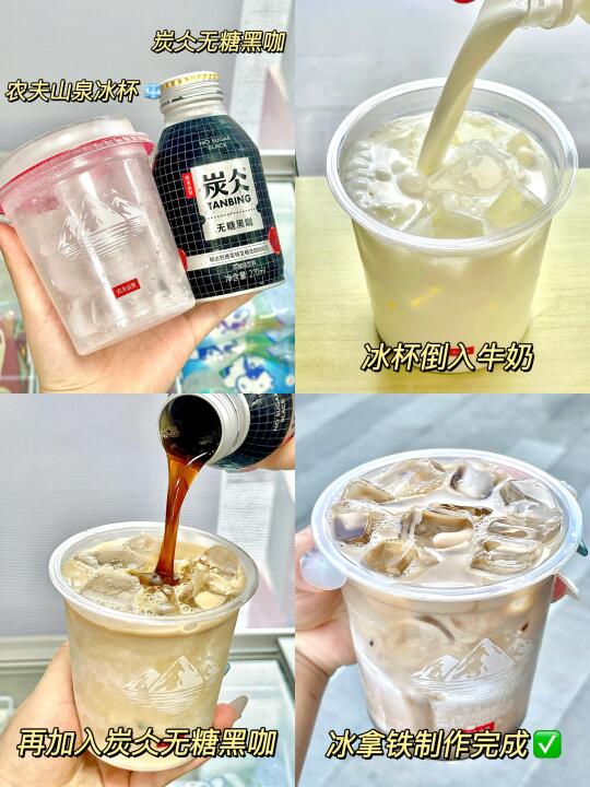 1.冰拿铁☕:农夫山泉冰杯🧊➕炭仌无糖黑咖➕牛奶!通勤办公随手做~再也不怕咖啡烫嘴啦