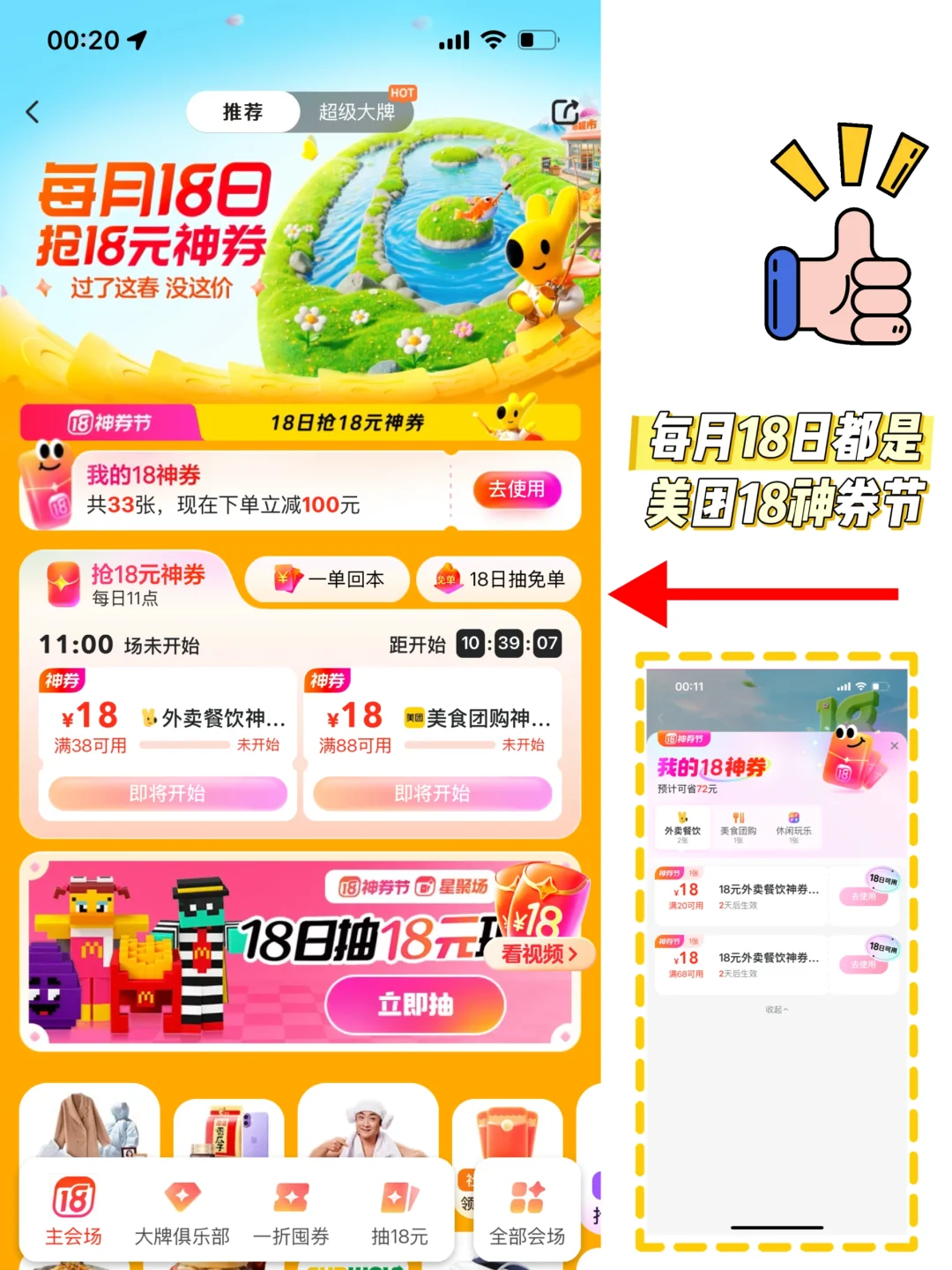 美团App搜【神券节美食】超多大牌商家都使用都可以领18神券享受超大优惠!