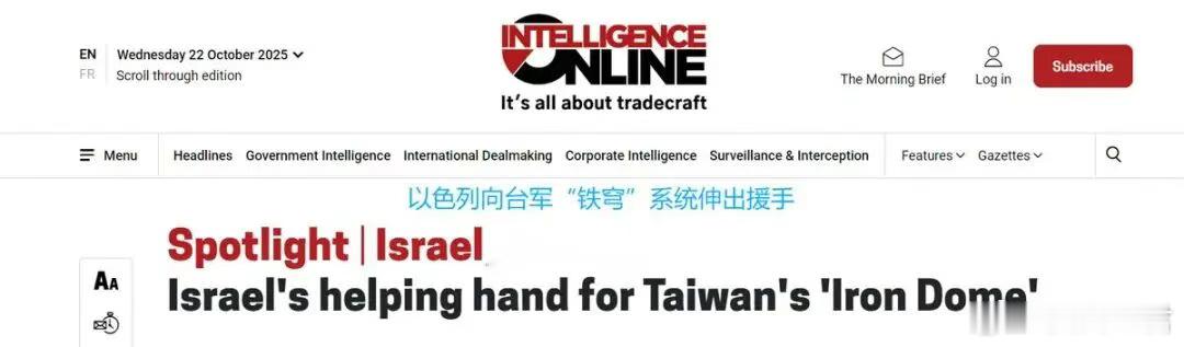 法国调查新闻媒体“情报在线”(IntelligenceOnline)对外披露称,在赖清德宣布打造所谓的“台湾之盾”防空体系之后,台湾地区正秘密派遣一名特使前往以色列“取经”。图注:法国调查新闻媒体“情报在线”(IntelligenceOnline)披露的原文报道报道提到,考虑到台湾地区计划打造的“台湾之盾”体系与以色列用铁穹系统、爱国者系统、箭2和箭3反导系统打造的综合防空反导体系概念相近,所以台军方面认为,可以学习以色列的架构来建设自己的综合防空反导体系。