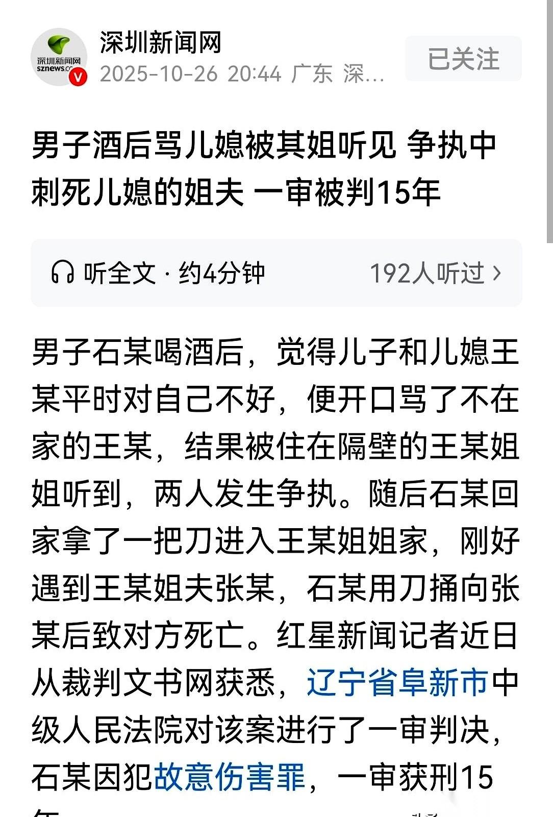 有些事儿,你听完都觉得后背发凉,不是因为多血腥,是因为太荒唐了。 一个老头,自己在家喝了七八两白酒,越喝越觉得憋屈,觉得儿子儿媳对自己不好。 然后呢? 他跑去大门口,指名道姓地骂儿媳妇。 结果儿媳妇不在家。 这事儿巧就巧在,儿媳妇的亲姐姐住隔壁。 姐姐听不下去了,出来说了他两句:一把年纪了,哪有公公追着骂儿媳的。 这下可好,捅了马蜂窝。 老头吵不过,回家了。你以为他消停了?他回去拿了一把镐头,一把尖刀,又杀回来了。 这时候,更倒霉的人出场了——儿媳的姐夫,刚下班回家。 看见这亲戚喝得醉醺醺,手里还拿着家伙,就想把他推回家,让他别闹了。 就这么一推。 老头直接掏出刀,对着人家肚子就是一下。 然后,自己晃晃悠悠走了。 人,没抢救过来,死了。 最讽刺的是什么? 老头酒醒了,知道自己闯了大祸,怕了。 给自己女儿打了个电话,说自己要去自首,然后骑着三轮车出门,半路被警察拦下。 最后判了15年。 因为他酒后激情犯罪,因为他有自首情节,因为是亲戚间的“琐事”。 一条人命啊。 就因为一个老酒鬼的“我觉得”,一个和事佬的“你快回家吧”,就这么没了。 那个姐夫,他招谁惹谁了?他只是下班回家,想平息一场莫名其妙的家庭纠纷,结果把自己的命搭进去了。 有时候,最大的悲剧不是蓄谋已久的仇恨,而是这种突如其来的、毫无道理的恶意。 一杯酒,几句口角,就能带走一个无辜的人。 这比什么都让人感到无力和心寒。