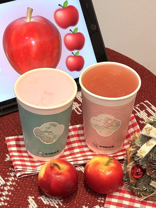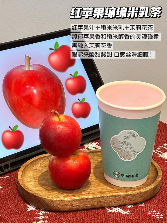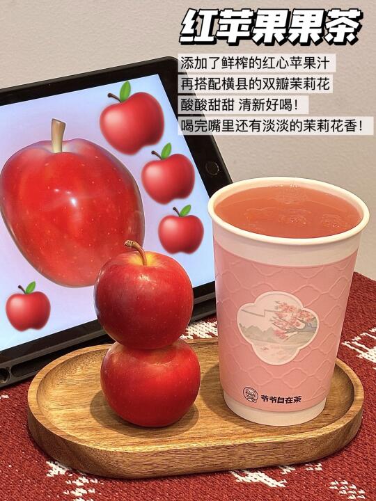 啊啊啊终于找到了我的本命苹果茶了! 就是爷爷自在茶新品!红苹果系列🍎 单杯才12.9💰尝了下真滴狠狠爱住😻 - 🌾红苹果绵绵米乳茶 稻米和苹果茶是什么奇妙的搭配! 红苹果汁➕稻米米乳➕茉莉花茶 喝起来酸甜酸甜 口感丝滑细腻! 馥郁苹果香和稻米醇香的灵魂碰撞 再融入茉莉花香! 果香稻香茶香 层层递进 谁懂这一口下去的含金量! 🍎红苹果果茶 添加了鲜榨的红心苹果汁 再搭配茉莉之乡横县的双瓣茉莉花做成的茉莉花茶 酸酸甜甜 清新好喝!喝完嘴里还有淡淡的茉莉花香! 这两杯都是0反式脂肪酸 好喝轻负担!家人们放心冲! - 下午茶怎么能少得了甜品呢! 一定要试试巨大的提拉米苏风味蛋挞! 比脸还大的蛋挞🤣跟朋友都吃撑了! 外面是一层酥脆挞皮 里面是滑嫩挞芯和绵密的戚风蛋糕 顶部还撒了可可粉 一口下去绵软细腻 感觉真的在吃提拉米苏!