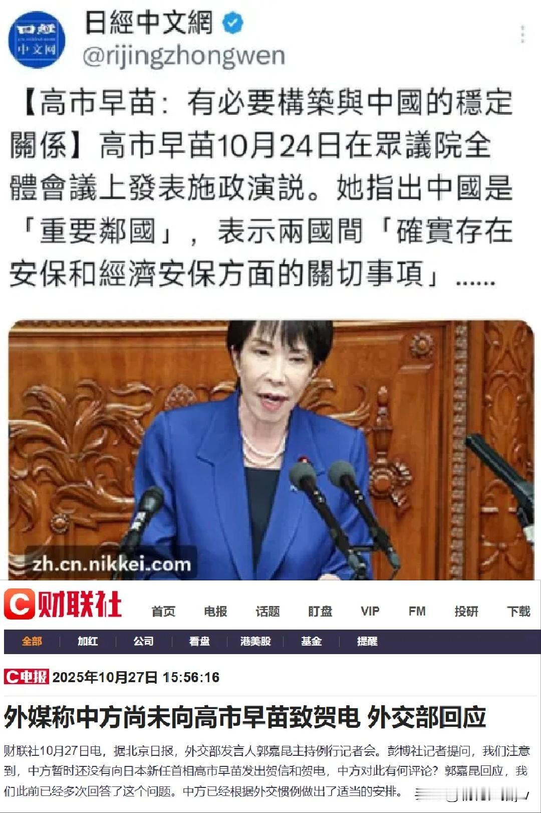 高市早苗绷不住了! 为了要个贺电也是拼了。 临上台前,鼓吹让日本军事力量重新变成所谓“正规军”,否认日本的侵华历史,“台海有事就是日本有事”… 没想到上台后却一反常态,在施政演说中指出中国是“重要邻国”, 表示日本有必要和中国构筑建设性且稳定的关系。 她太需要中国的祝贺了! 就连美媒彭博社都忍不住跑过来问:为什么不给早苗发贺电? 我国发言人直接回了16个字:中方已根据外交惯例作出适当安排。 对于她之前的言论,我们不惩罚她也就算了,还要祝贺? 实话实说,我们还是喜欢她搞事的样子!
