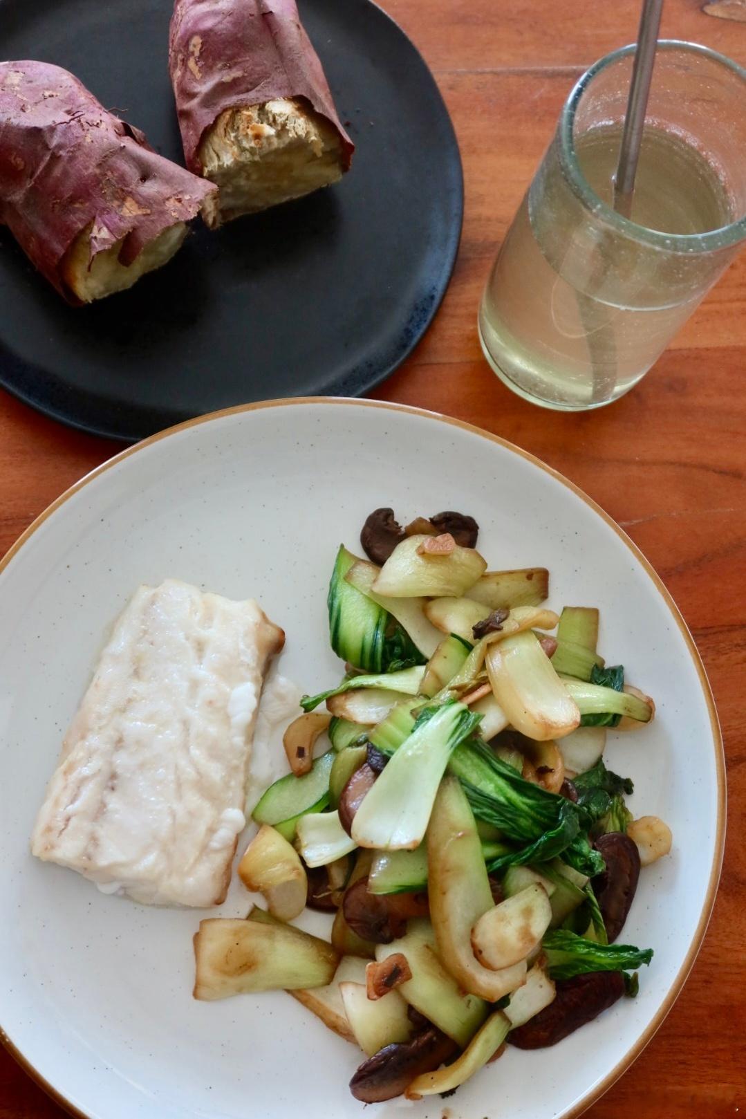 午餐:上海青炒口蘑、烤野生大西洋鳕鱼、烤红薯🍠