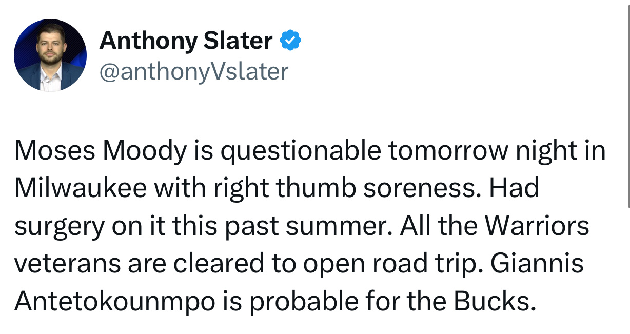 队记斯莱特:穆迪明日比赛出战成疑,因右手拇指酸痛,能否出战明天在密尔沃基的比赛存疑。他今年夏天接受了拇指手术。勇士队所有老将都已获准参加客场之旅。扬尼斯阿德托昆博(左膝酸痛)可能代表雄鹿队出战。