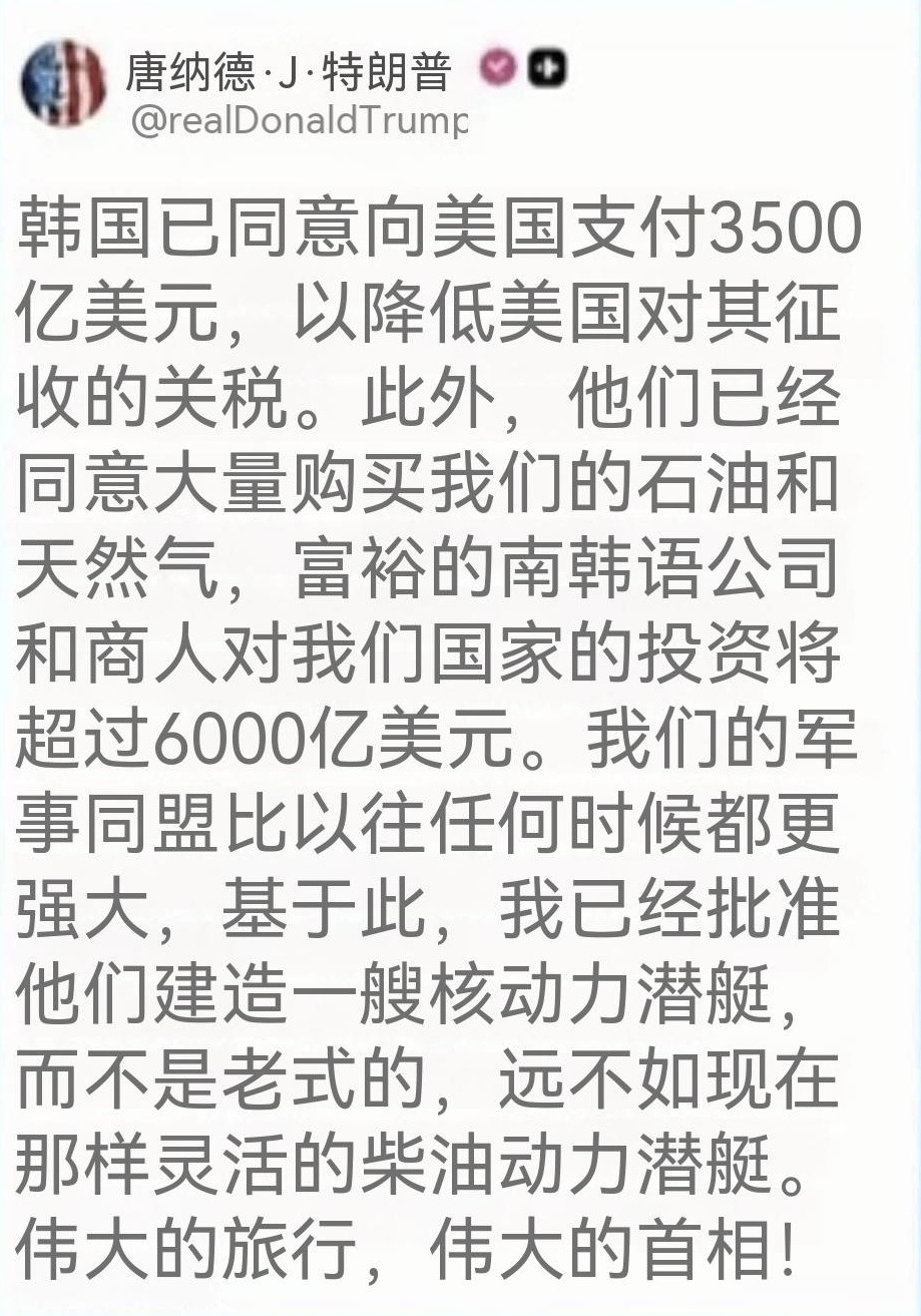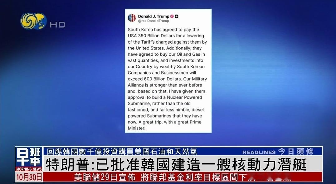 特朗普访问马日韩特朗普发文称已经批准韩国建造一艘核潜艇,建造地点将在美国费城。