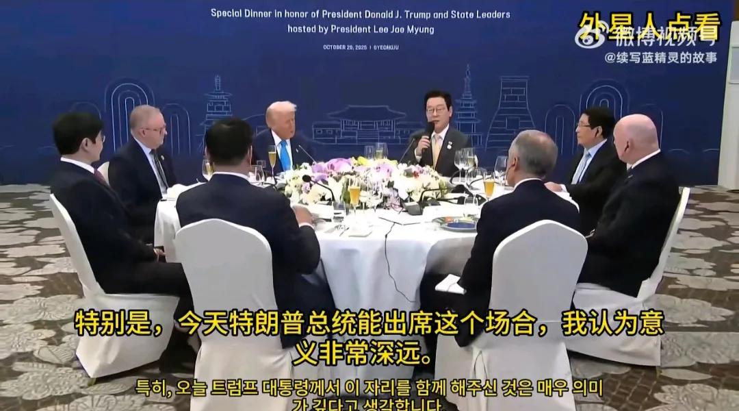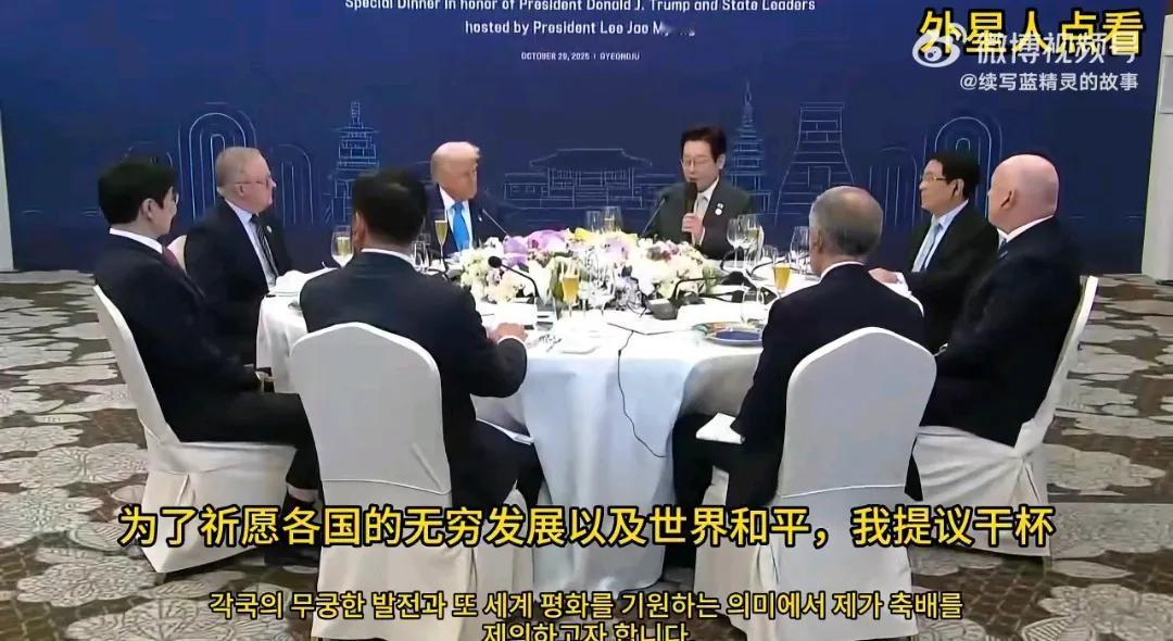 吃晚宴,后面一帮人盯着你吃 不自在 一帮大佬挤在一张一张小桌子上 不大气 李在明为特朗普准备了两道专属菜 “追忆纽约成功往事沙拉” “韩式诚意拼盘配美国牛肉” 李在明在这几个国家领导面前拍特朗普,给了他们表演了一个样板: 加拿大总理马克·卡尼 澳大利亚总理安东尼·阿尔巴尼斯 泰国总理阿努廷·查维拉古尔 新西兰总理克里斯托弗 看看,我们就是这样做事的,你们都学着点。 李在明的世界和平而干杯,演过头了。 李在明