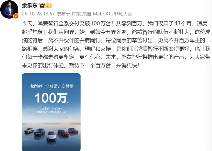 鸿蒙执行交付破百万 近日,华为常务董事、终端BG董事长、智能汽车解决方案BU董事长余承东通过个人微博宣布,鸿蒙智行全系交付已突破100万台。从零到百万,鸿蒙智行仅用了43个月,这一速度超越了国内外大多数新势力品牌。“我们从问界开始,到如今五界齐聚,鸿蒙智行的队伍不断壮大。”余承东在微博中表示。这一成绩标志着华为智能汽车业务迈入规模化发展新阶段。