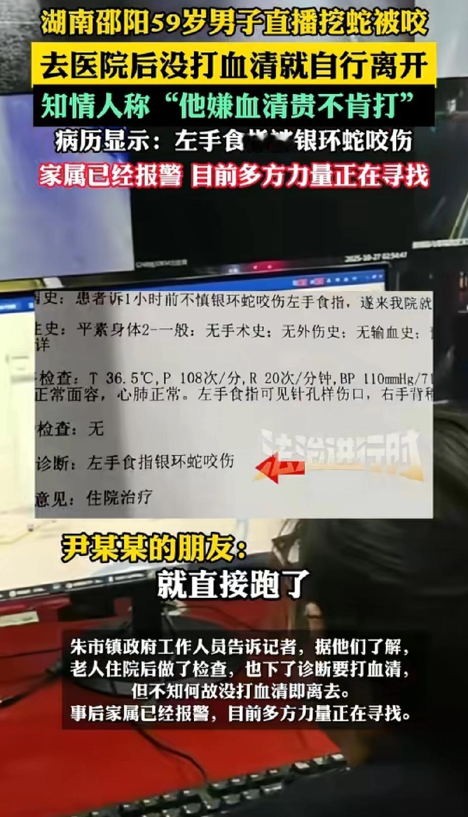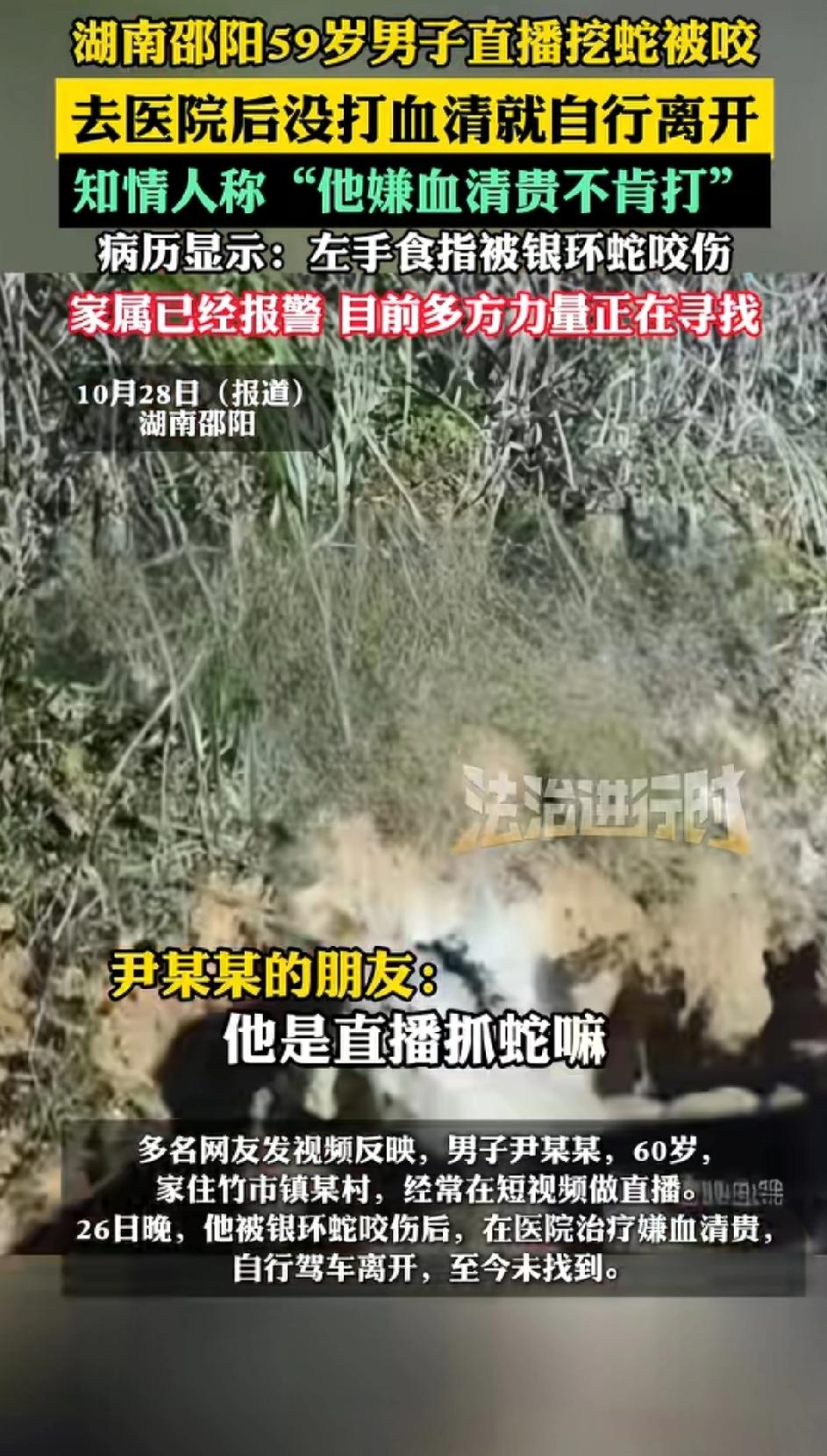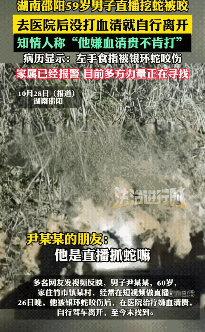 “太惊险了!”湖南邵阳59岁男子直播抓蛇,结果被蛇咬到了 。去医院治疗需要打血清,因为血清太贵了,他竟然自行离开 了。 根据法制进行时的报道 ,59岁的尹某,在26日晚直播抓蛇 。在这个过程中不幸被蛇咬到。他嫌血清贵,不肯打针,然后自行离开了,现在家属已经报警,多方力量正在寻找 。 网友热议 ,有可能囊中羞涩,又不敢告诉家里人,怕被责怪。 他抓蛇可能觉得常年跟蛇打交道不会死, 抱着侥幸的心理不打针。 就是单纯的觉得自己不会死。 在野外活动,受伤了应该立马去医院救治 ,跟时间赛跑,活着比什么都重要 。 对此你怎么看 ?