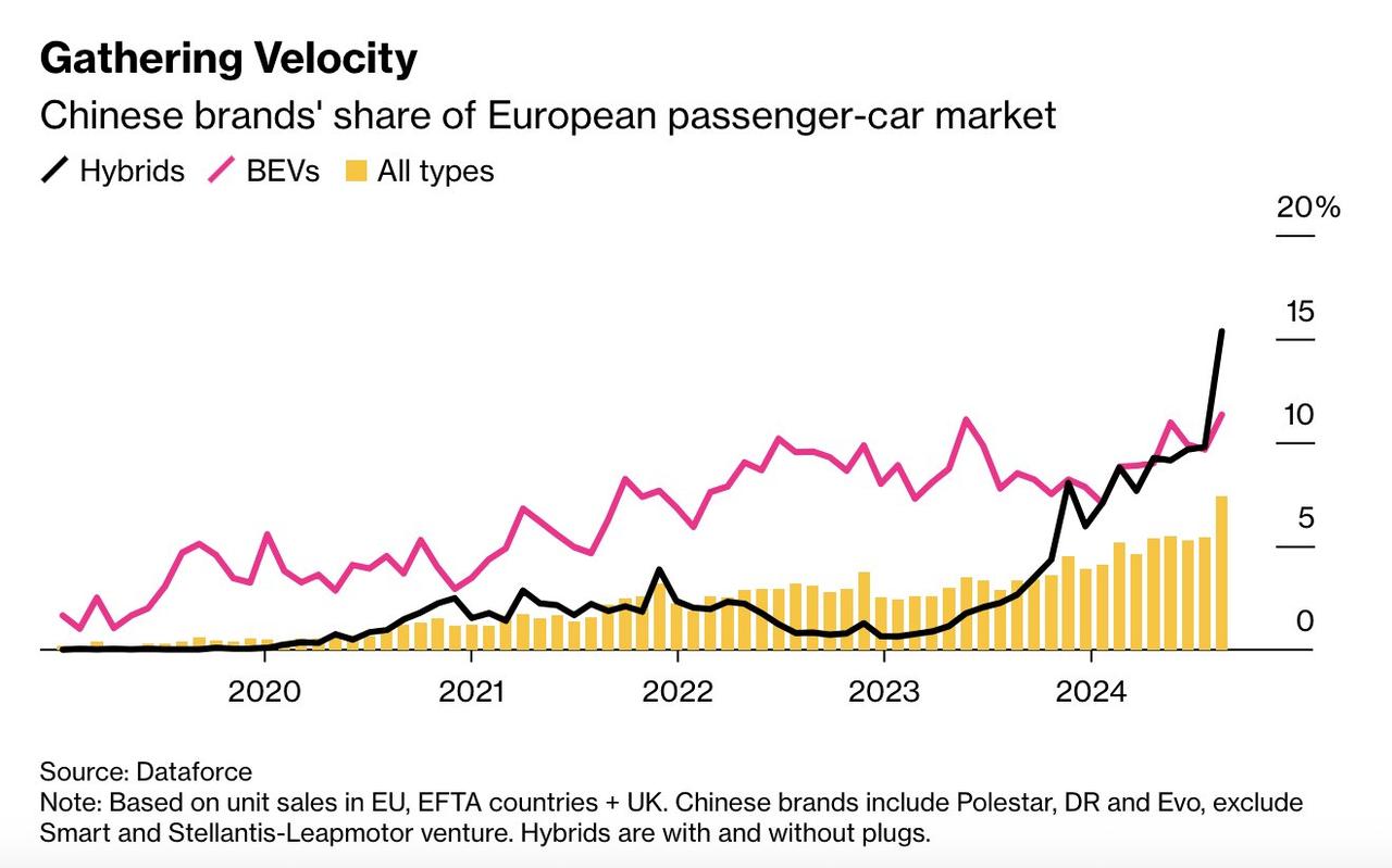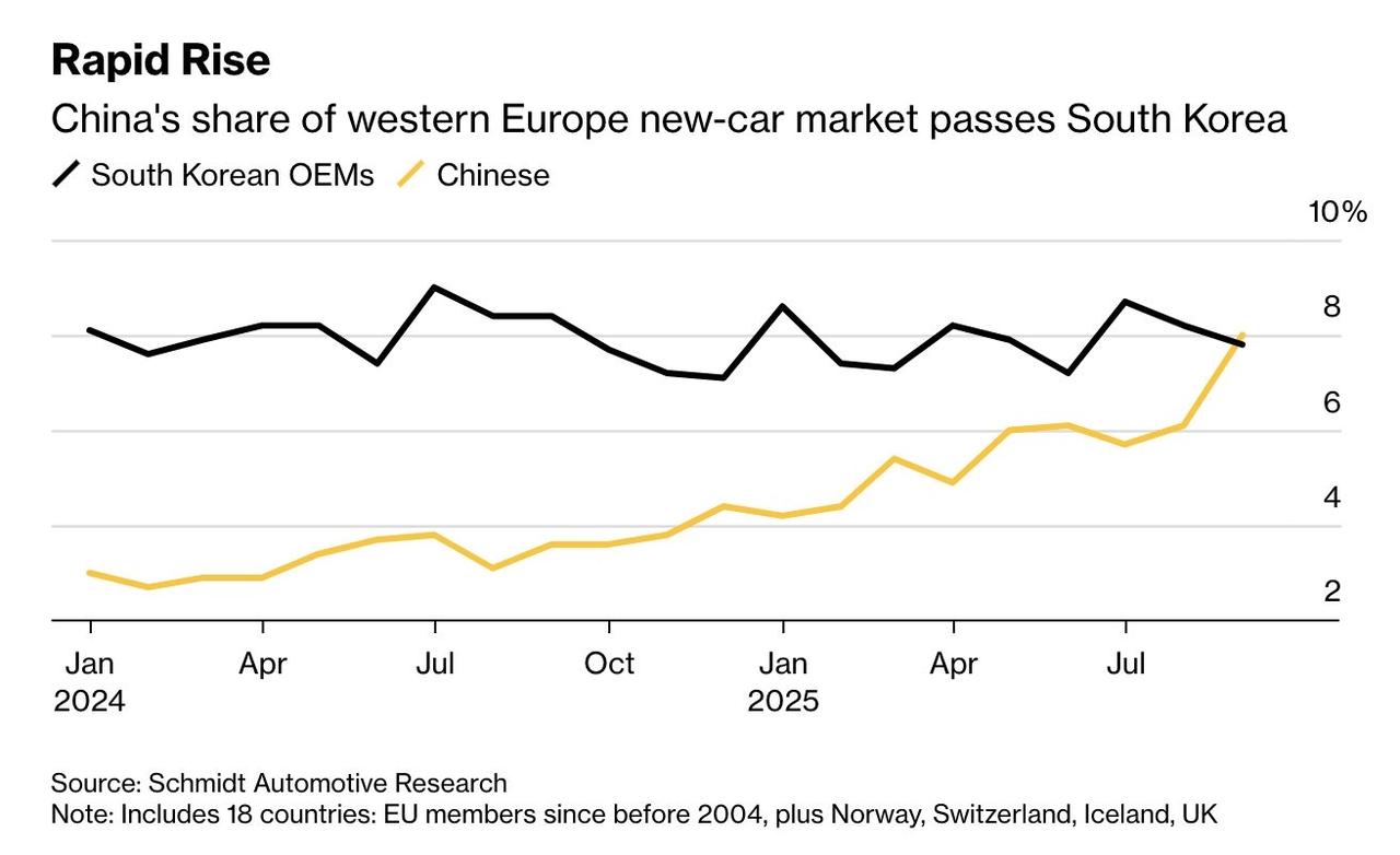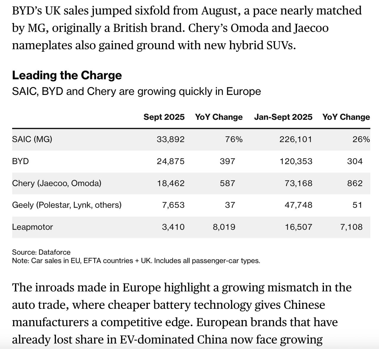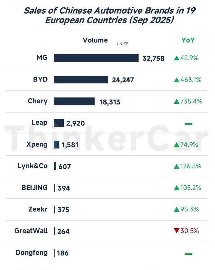 中国汽车在欧洲干过了韩国汽车,创下历史最佳月销量。 比亚迪、名爵、奇瑞等品牌,市场份额达到创纪录的7.4%,首次把韩国起亚甩在身后。 比亚迪在英国和8月比,销量增了六倍。这个增长速度,已经快赶上本有英国基因的MG了。 奇瑞旗下的两个品牌O&J,也表现很好。凭借新的混动SUV,取得了不错的成绩。