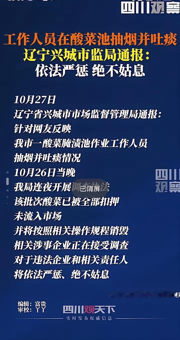 “老痰”酸菜 毁掉一个厂 不是运气差 是心太黑 不是操作失误 是底线全无 腌菜池里吞云吐雾 一口浓痰落地 还得用脚碾实 旁边人习以为常 没人觉得不妥 这哪是做食品 分明是喂毒 把消费者当冤大头 把卫生标准当摆设 赚着国人的钱 糟践着国人的胃 以为神不知鬼不觉 殊不知纸包不住火 行业的脸 被这帮人丢尽 消费者的信任 被这么个操作碾碎 做食品就是做良心 良心喂了狗 生意能长久才怪 砸饭碗的不是拍视频的人 是自己那双不干净的手 没有敬畏心 再好的生意也得黄 不讲卫生观 再大的厂子也得凉 你说这样的商家 配赚老百姓的辛苦钱吗