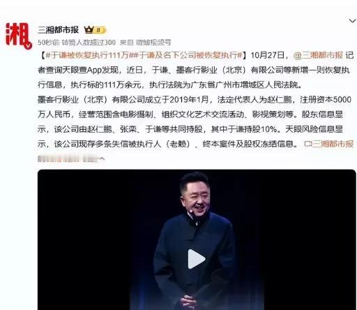 名表豪车不如腰间一串钥匙实在,可于谦马场的钥匙,这次却打不开资本游戏的锁。 一纸恢复执行111万元的裁定书,让佛系大爷于谦首次站上失信风口浪尖。吃瓜群众懵了!这位在北京坐拥60亩马场,四合院挂满名画的顽主,竟还不上区区百万? 这事挺复杂。这笔债务并非于谦个人欠款,而是其持股10%的墨客行影业公司纠纷的连带责任。这家公司曾投资《老师·好》等影片,如今累计被执行金额高达7554万元,已濒临破产。 于谦的投资版图遍布影视,养殖,餐饮等11家公司,其中多数合伙人是马场茶局结识的熟人。这种人情捆绑的投资模式,在行业景气时稳赚不赔,一旦市场遇冷,风险便集中爆发。 更值得警惕的是,若墨客行进入破产程序,于谦作为股东可能需提前实缴500万认缴出资,这才是真正的隐形炸弹。 于大爷还被翻出其名下养殖公司欠款30万,经营异常的旧账。而此前杨议直播吐槽于谦基本功退步的争议再被翻炒,虽杨议辟谣称视频系AI伪造,但舆论漩涡已越卷越大。 商业与艺术的边界,从来不是马场里的一杯清茶能模糊的。资本相信合同,而非相声台上的包袱。 于谦的团队已表态依法配合处理,德云社也声明演出照常。但此事给所有跨界明星敲响警钟!流量抵不过现金流,人情替不了风控。毕竟法律不会因为你是谦儿大爷就网开一面。