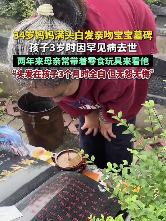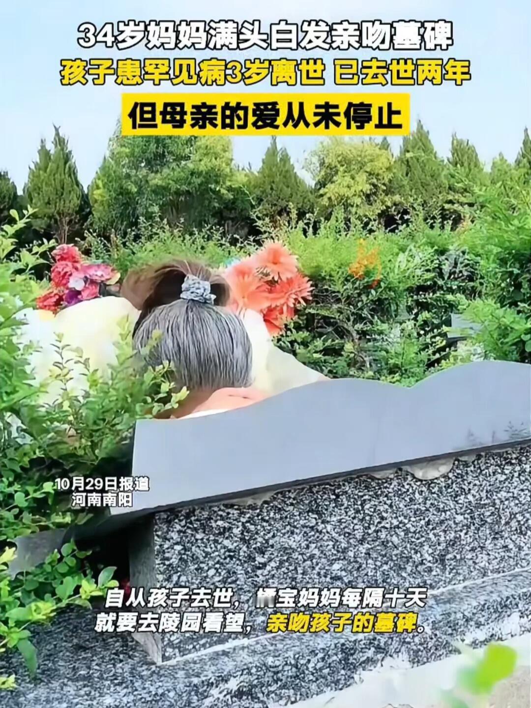 看到个新闻,心里挺不是滋味的。河南南阳一位34岁的妈妈,两年时间头发全白了。搁一般人身上,这个岁数正是年轻的时候,可她经历的痛,咱们外人真的很难想象。 她有个三岁的孩子,得了罕见的病,没救回来。孩子一走,她的天就塌了。才两年啊,一头黑发就愁成了满头白。这白发,就是活活给熬出来的。 人虽然不在了,当妈的心却一刻也没放下。她现在每隔十天半个月,就要大老远跑去孩子的墓地。去了也不干啥,就是蹲在那儿,用手摸摸冰冷的墓碑,就像以前摸孩子的小脸一样。她会对墓碑轻轻说话,还会上去亲一下。那个亲,看得人心里发酸,那里头藏了多少舍不得和想念。 说真的,这世上最疼的事,恐怕就是当爹当妈的白发人送黑发人。每次看到这种新闻,都忍不住想想,要是换做自己,该怎么办?可能一辈子都走不出来吧。 她这个事儿,也让人忍不住琢磨。要是真到了要和最亲的人告别的那天,咱们会咋纪念他们?是常去看看,还是把对他们的念想好好放在心里,带着这份念想继续把日子过下去? 反正看完这个,就觉得啥都不如眼前人重要,能平平安安地在一起,比啥都强。
