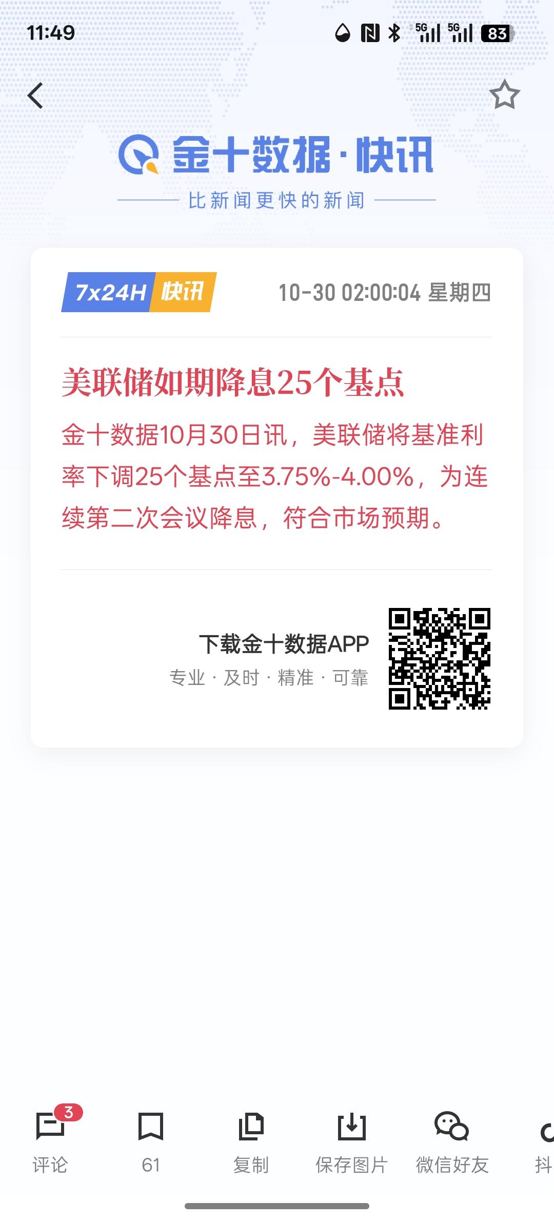 美联储如期降息25个基点,特朗普逼美联储降息,逼了那么多次,这一次连续降息,说不定12月份还会降息。美国自身的财政压力已经不能支撑高昂的利率,持续高利率可能还会导致更多的美国银行破产或者爆雷!美国的高昂债务也不允许美联储保持高利率时代! 现在美国经济自身有下行的压力,美联储如果还坚持不降息,对美国经济会造成一定的冲击!