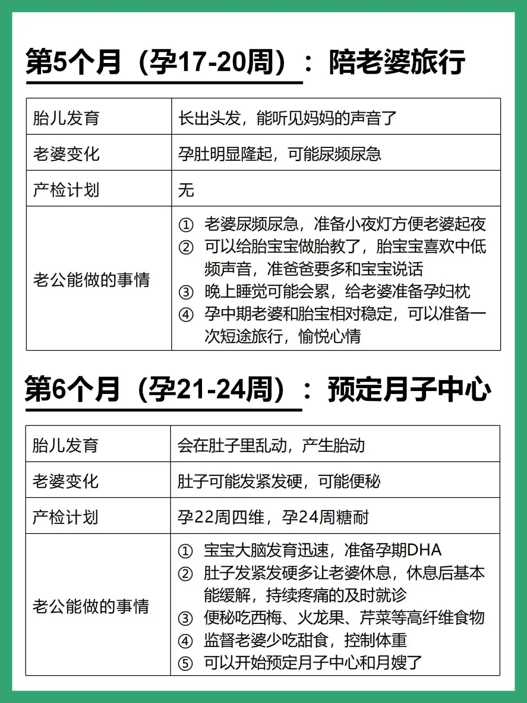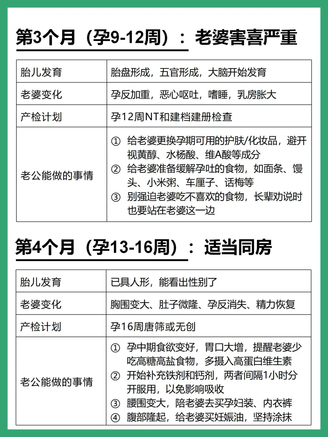 孕1月:老婆怀上啦 孕2月:要当爸爸啦 孕3月:老婆害喜严重 孕4月:适当同房 孕5月:陪老婆短途旅行 孕6月:预定月子中心 孕7月:数胎动 孕8月:拍孕妇照 孕9月:准备待产包 孕10月:宝宝出生啦 · 怀孕孕期孕期必看怀孕那些事孕期日常准爸爸必看的孕期知识