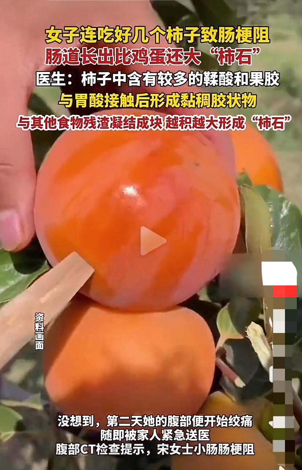肠道里长出一个鸡蛋大的“柿石” 我问我爸还敢不敢吃柿子 看到这样的新闻心里一阵慌, 我爸是一个很爱吃柿子的人, 经常跟他说柿子不能多吃,不信, 果不其然,真的有人吃柿子吃出问题了,宋女士连吃几个柿子后不舒服,送到医院后才知道,原来肠梗阻,里面长出一个像鸡蛋一样大的“柿石”。 身边有爱吃柿子的朋友,一定要告知他们不要贪吃,吃多无益,身体最重要!