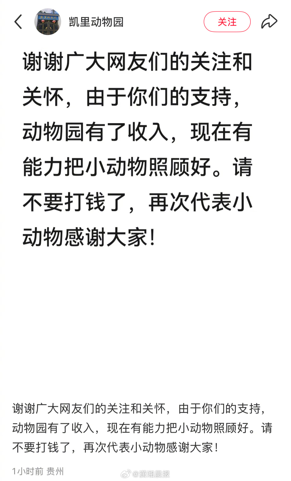 【#凯里动物园称现在有能力照顾动物了#】#凯里动物园请网友不要打钱了#10月30日,潇湘晨报综合。近日,凯里动物园爆火,动物园发文称“谢谢广大网友们的关注和关怀,由于你们的支持,动物园有了收入,现在有能力把小动物照顾好。请不要打钱了,再次代表小动物感谢大家!”