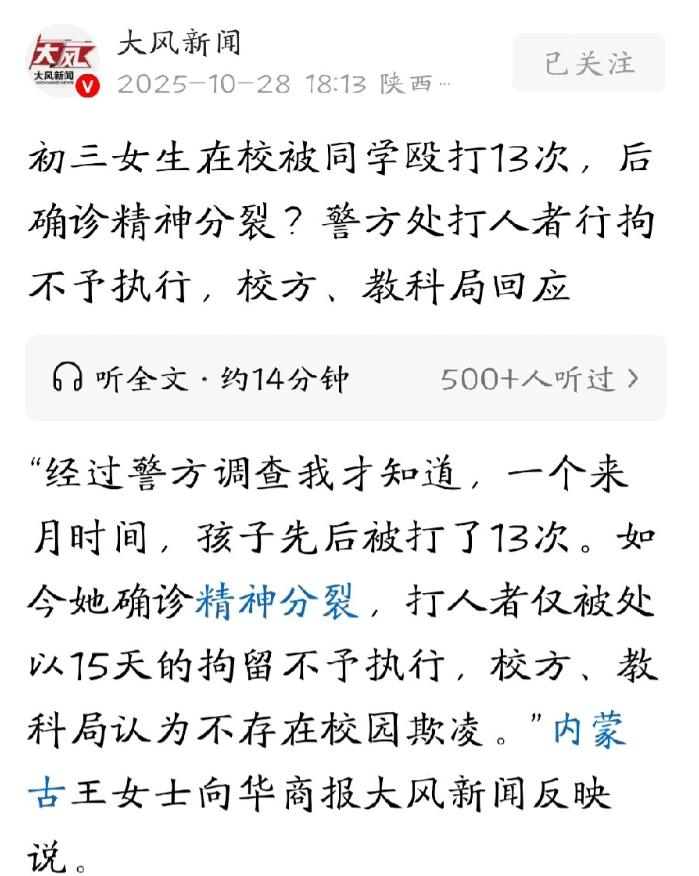 太恶劣了!内蒙古,女子发现上初中的女儿精神恍惚,寝食难安,而且不停的问家里要钱,她觉得很不对劲,一打听才得知,女儿竟然多次在学校被同班女同学殴打。女子惊了,跑到学校要求查看监控,这才发现,短短一个月,女儿被殴打了13次,扇耳光、掐脖子、拽头发撞墙,但她一次都没有还手。女子的心在滴血,马上报警。但因为涉事学生未满16岁,没有被拘留,女子不甘心,找学校讨要说法,谁知,学校的态度更让人气愤。 这事儿发生在2022年的内蒙古额尔古纳市第二中学,被打的女孩小郝原本正面临中考,本该在教室里安心备考的花季少女,却在校园里遭遇了长达一个多月的噩梦。 从5月到6月,短短一个多月时间里,同班同学高某对她的暴力行为就有13次之多,有时是因为自己考试失利心情不好,就把怨气撒在小郝身上,撕毁她的书本作业,有时仅仅是看她不顺眼,就动手扇耳光、掐脖子,甚至拽着头发往墙上撞。 更让人揪心的是,高某还威胁小郝不许和其他同学交往,让她在学校里孤立无援,而小郝因为害怕,一次都没敢还手。 小郝的这些遭遇,其实早有信号,那段时间,原本温顺的她变得越来越沉默,精神恍惚,吃不下睡不着,还总害怕去学校,甚至十多次向家里要钱,从几十元到几百元不等,这些都是她在向家人发出无声的求救。 可直到家长察觉到不对劲,主动去学校打听,才知道女儿在学校遭受了这么大的委屈。 家长跑到学校要求查看监控,校方一开始还以“学生隐私”为由拒绝,后来即便看了监控,给出的说法也让人无法接受。 校方竟然说两个孩子“关系好”,只是普通的“肢体冲突”,很快就能和好,压根不认定这是校园欺凌。 可监控里清清楚楚记录的13次殴打,每一次都是赤裸裸的暴力,哪里是什么“关系好”的表现? 更让人愤怒的是,有多名学生之前就向校领导反映过高某的暴力问题,甚至副校长都亲眼目睹过一次暴力过程,却没有及时制止,就这么眼睁睁看着悲剧持续发生。 家长报警后,警方调查确认了高某的暴力行为,给出了行政拘留15日、罚款1000元的处罚,可因为高某当时只有15岁,未满16周岁,最终拘留没有执行,这样的惩戒对受害者家庭来说,实在太无力了。 为了给小郝治病,家里已经借了两万元,而小郝最终被诊断为未分化型精神分裂症,不仅错过了中考,原本光明的未来也蒙上了阴影,她反复念叨着“我不是傻子”,让人听了心疼。 高某的监护人曾提出5万元赔偿想和解,但小郝的家人坚决拒绝了,他们想要的不是钱,而是一个公道。 事件最后,校长被诫勉谈话,亲眼目睹暴力却不制止的副校长受到警告处分,班主任也被调离岗位,可这些迟到的处理,再也换不回小郝的健康。 校园本该是最安全的地方,可当施暴者因为未成年就可以近乎“免责”,当学校本该有的保护变成了漠视和推诿,受伤的只能是无辜的孩子。 反校园欺凌从来都不是一句口号,需要学校真正负起责任,及时回应每一个求救信号,也需要更有力的制度来守护孩子们的安全。 大家对此怎么看?欢迎评论区留下您的观点!