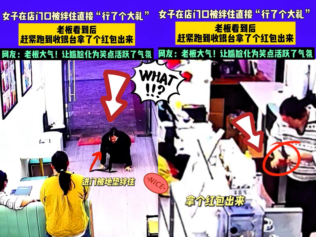 笑不活了家人们! 浙江一女子进奶茶店,竟被门口垫子绊了个“大礼”,尴尬得不行。可谁能想到, 老板反应超迅速,立马从收银台拿了现金塞进红包,火速递给女子。 这波操作直接把尴尬变温暖,网友都夸老板情商高! 寻常商家遇到顾客绊倒,可能就道个歉或假装没看见,可这老板却把“倒霉事”重新定义,说女子是来送喜的。这急智不仅化解了尴尬,还创造了独家记忆。而且啊,善意就是最好的营销,网友热议老板大气,无形中就完成了口碑传播,比花钱打广告强多了。 在人与人愈发疏离的今天,城市太需要这样的人情味了。老板损失一个红包,收获的远不止一个忠实顾客。你觉得生活中还有哪些化解尴尬的妙招呢?快来评论区分享分享!