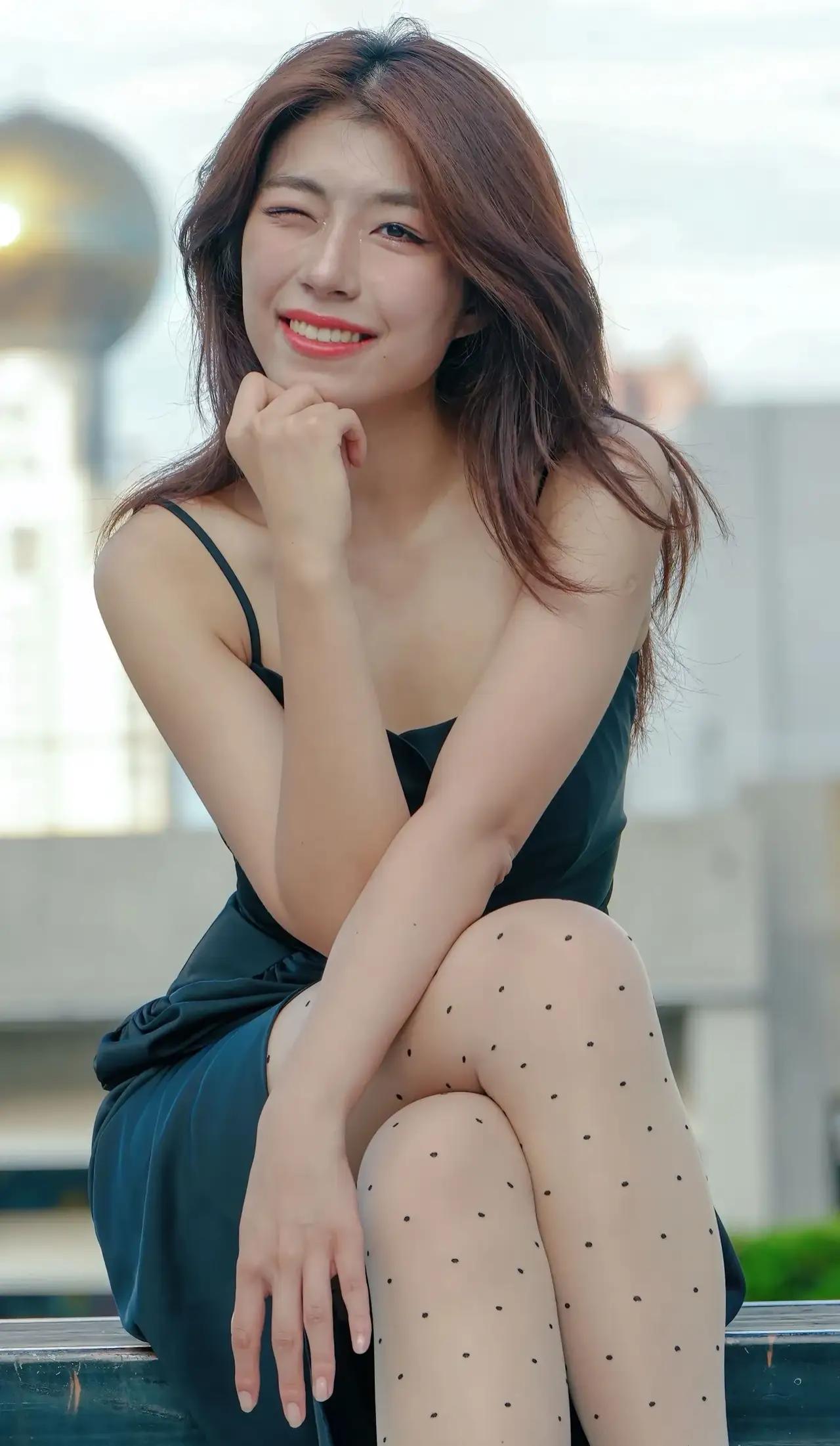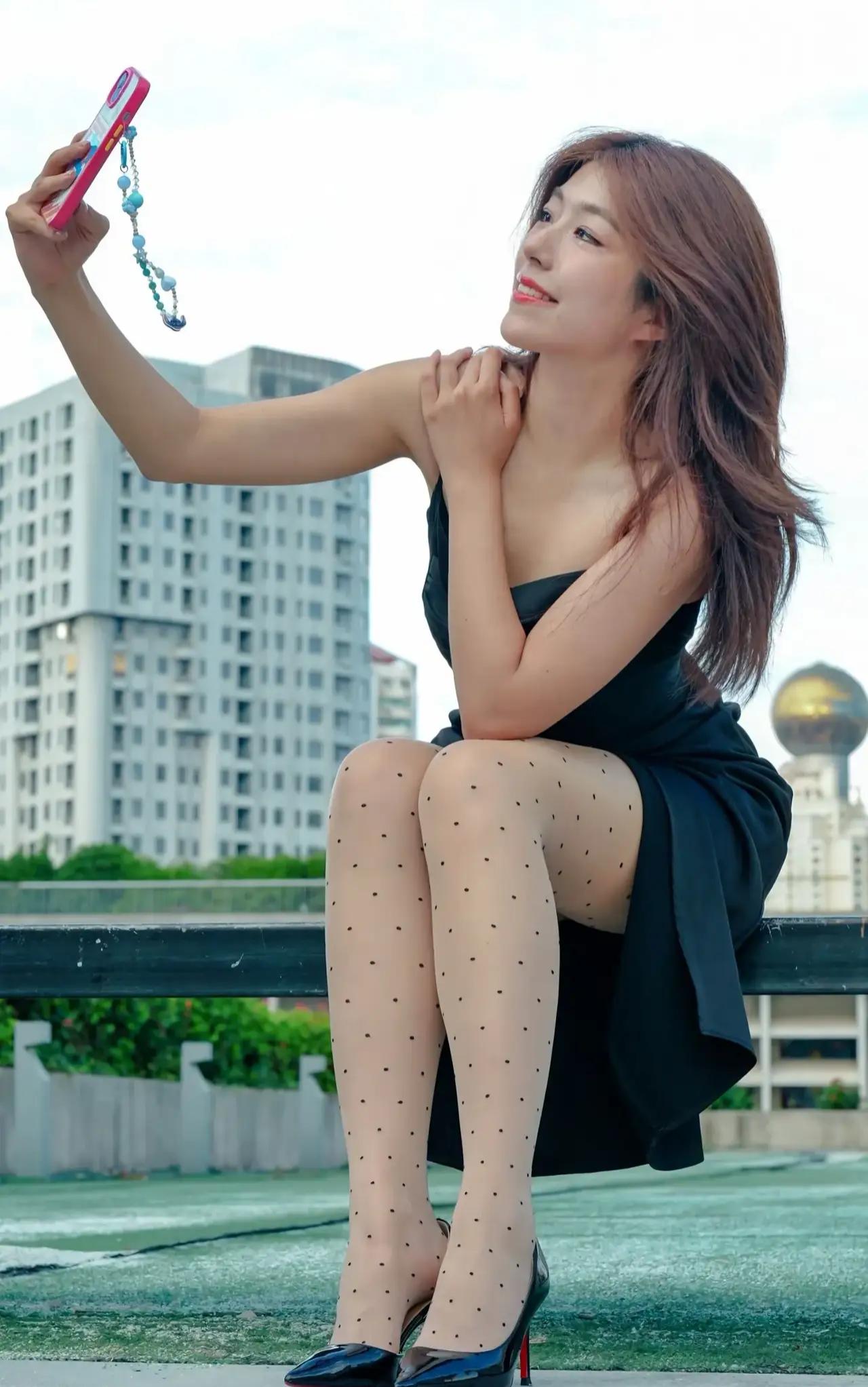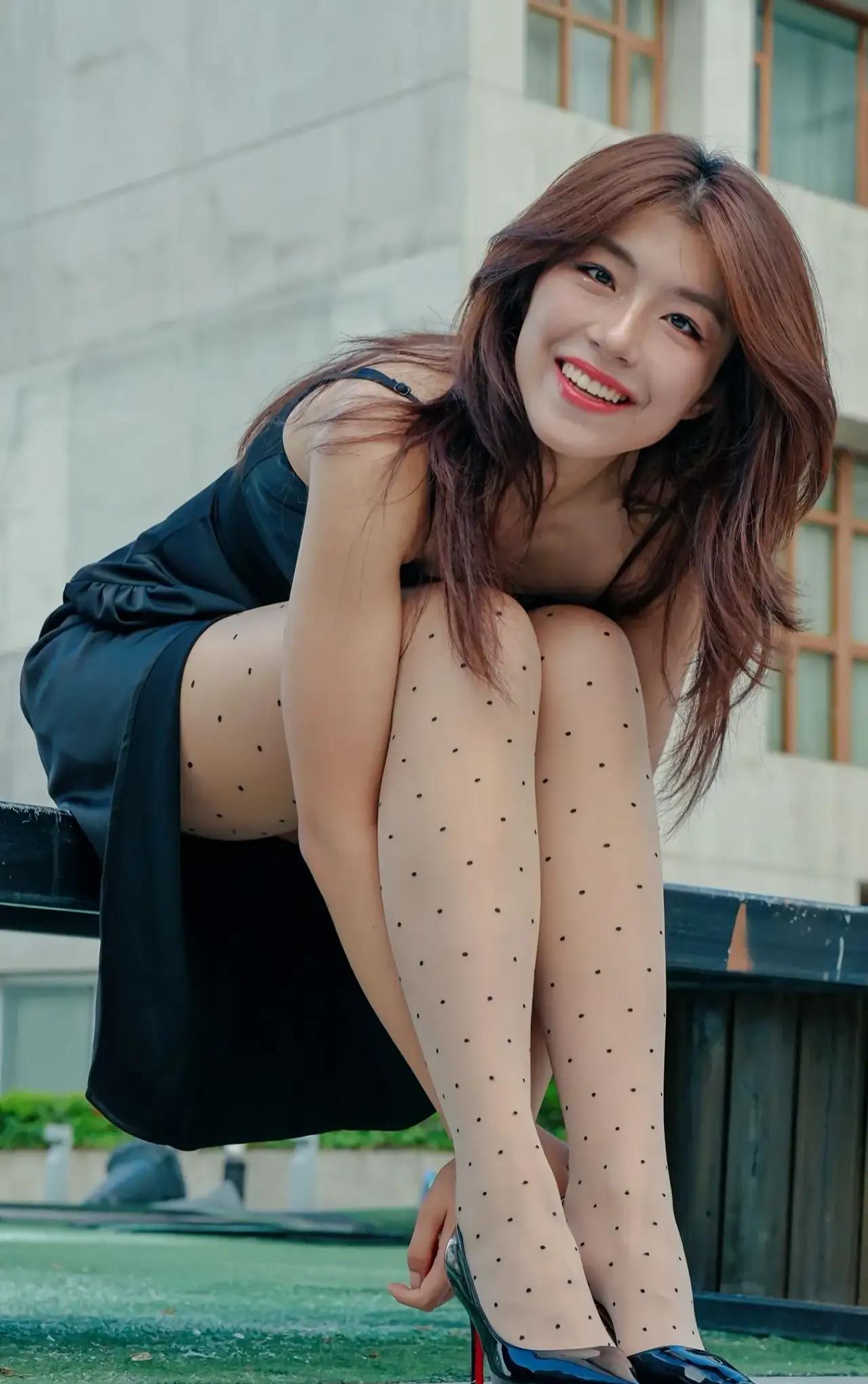 优雅黑裙与红唇,复古波点袜,都市时尚风