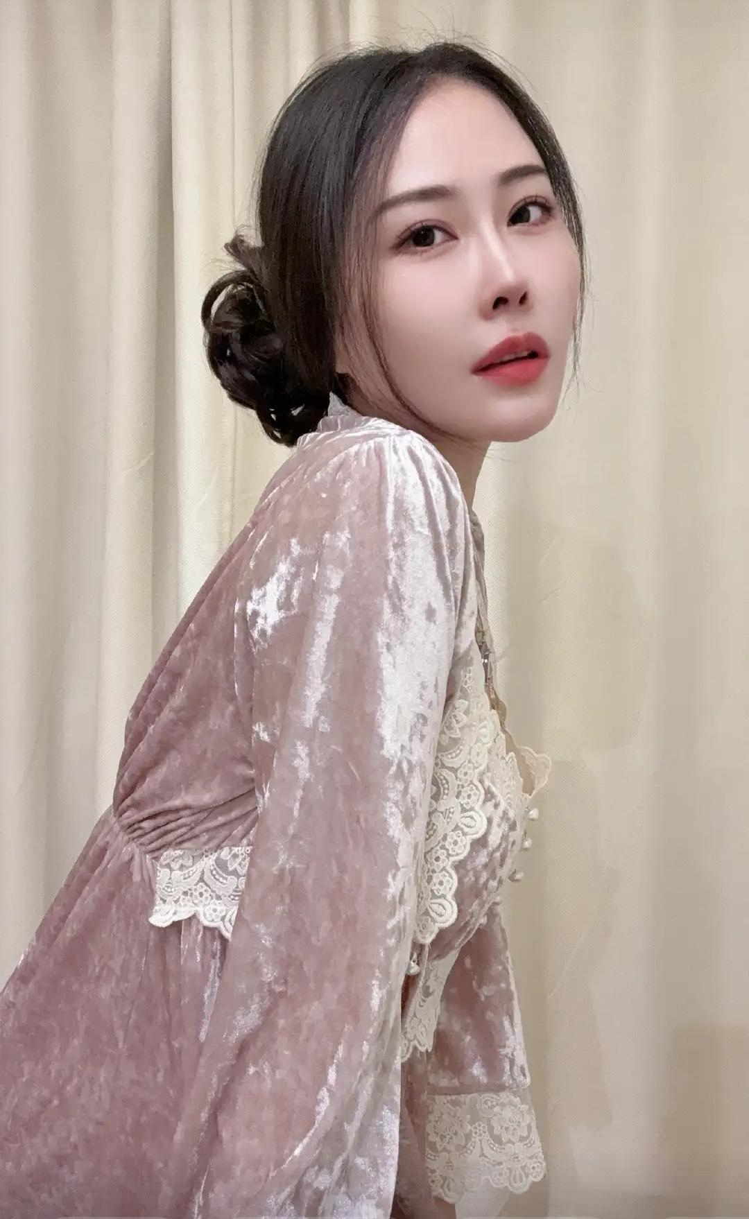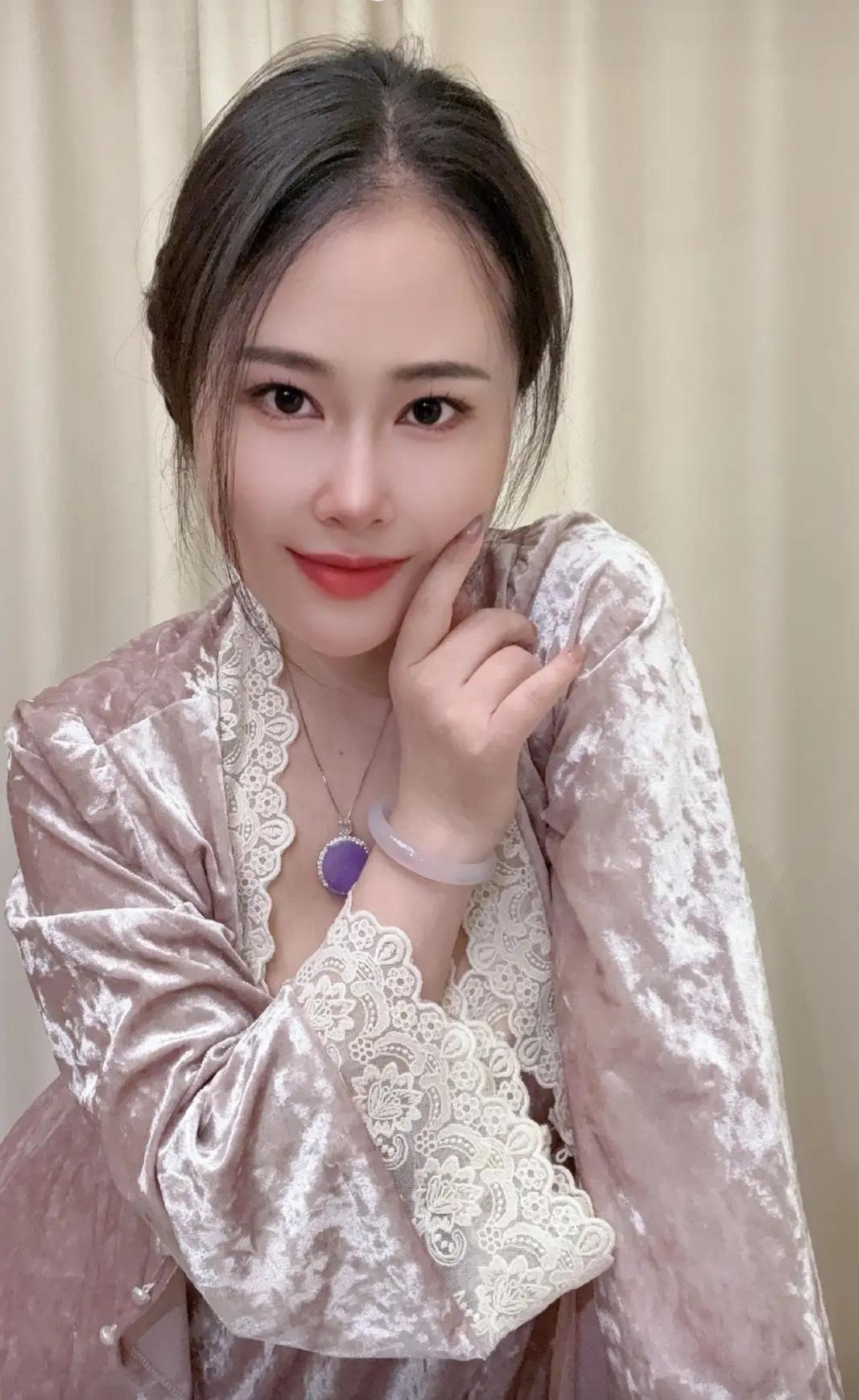 优雅复古风,紫色项链点缀,柔美蕾丝裙装,尽显女性魅力。