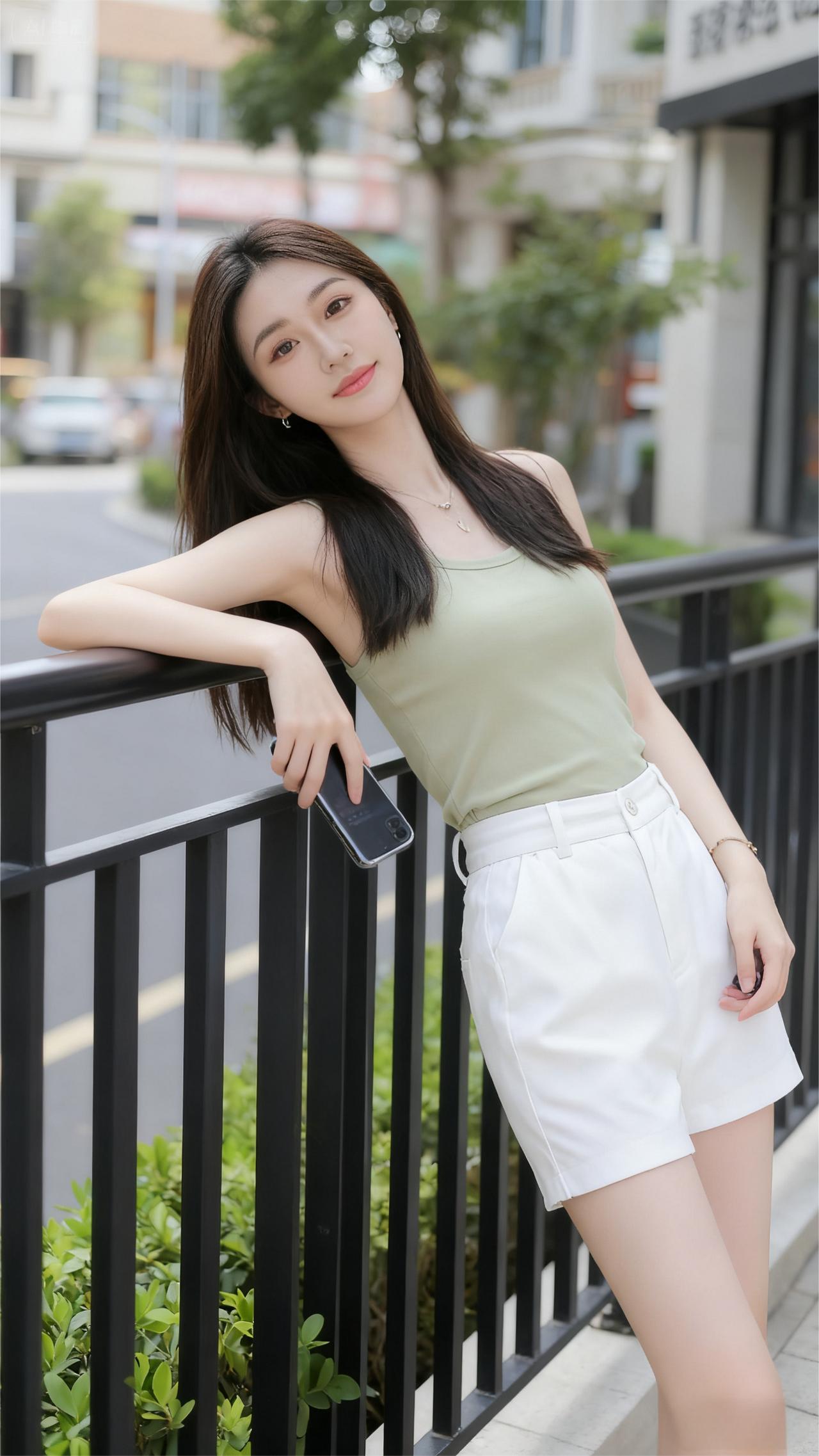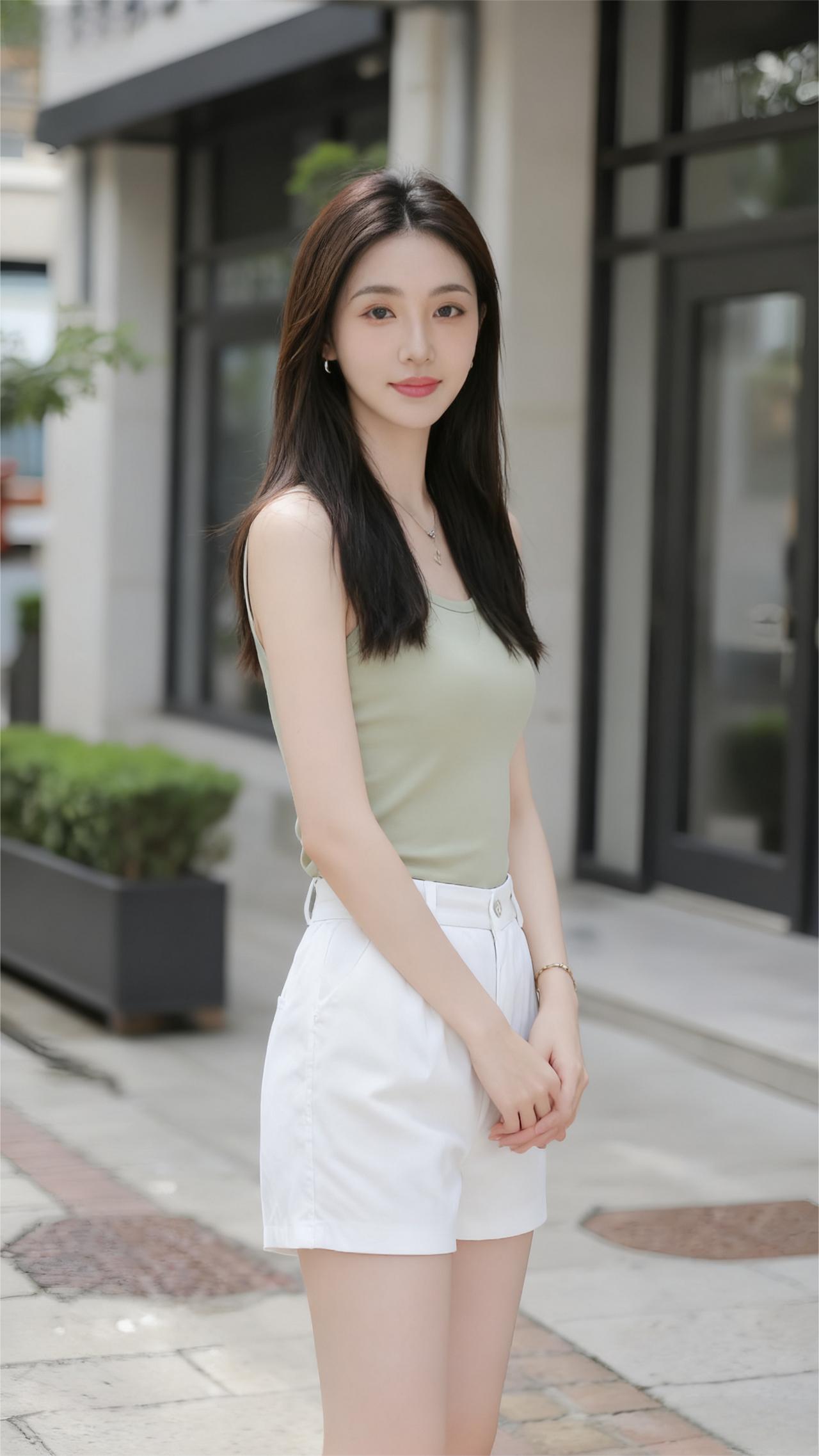 《街角的绿意》 她站在街角, 像一缕风穿过城市。 浅绿吊带轻贴肩, 白短裤收住阳光的弧度。 双手插在口袋, 不是随意, 是把整个午后都装了进去。 发丝微扬, 目光低垂又抬升—— 仿佛在等, 一个名字, 或一句“你好”。 她不说话, 却让街道, 也有了呼吸。