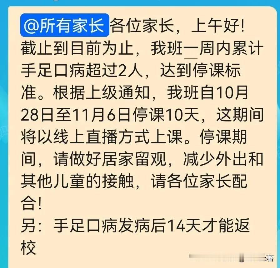 突如其来?嘉兴有学校班级紧急通知:停课10天;有孩子感染脸上全是结痂!已经进入高发期,传染性很强、要隔离! 突如其来的假期, 让小朋友开心,让家长不知所措! ↓↓↓ 嘉兴有学校已经发通知: 一个班停课10天! @第九区网友爆料: 嘉兴有学校已经发通知, 一个班级10月28号到11月6号, 停课10天! 班内一周累计手足口病超2人! 又开始上网课了, 对双职工家庭来说太不友好了, 各种打卡任务, 比自己上班还要累! 嘉兴有孩子感染手足口病, 脸上全是结痂的! 也有嘉兴家长晒出孩子感染手足口, 脸上都是结痂的! 孩子得病不如自己得病, 看着痛苦,全家人忙坏了! 已经进入高发期, 传染性很强,要隔离! 据了解, 手足口病其实一年四季都会发病, 每年有两个发病小高峰, 一个为6、7月份,另一个则为9、10月份, 而现在是手足口病的第二个高发期。 不少学校都发了通知! 手足口病是由肠道病毒引起的 急性发热出疹性传染病, 以手、足、口腔等部位的皮疹、疱疹 和全身发热为主要特征, 通过消化道、呼吸道和密切接触等途径传播。 由于手足口病传染性很强, 一旦得病,最好主动居家隔离! 预防手足口病 手足口病疫苗接种、良好的个人习惯 都很重要 养成良好的卫生习惯。 牢记“勤洗手、吃熟食、喝开水、勤通风、晒太阳”15字防病口诀。 做好日常消杀工作。 托幼机构、学校等集体单位,应加强晨检、消毒、全日健康观察等日常防护工作。 接种疫苗。 接种EV-A71灭活疫苗,可以预防EV-A71病毒感染相关的手足口病及其重症、死亡病例的发生。 及时就诊。 家长们要关注患儿病情变化,尤其是3岁以下患儿,一旦孩子出现持续高热、精神差、呕吐、易惊、手足抖动、肢体无力、嗜睡等症状,应立即带其就诊。